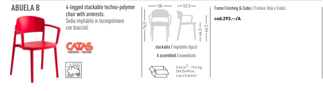 Krzesło ABUELA B wykonane w całości z technopolymeru. Dokładne wymiary na zdjęciu w galerii. Krzesło przeznaczone do użytku zarówno do wnętrz jak i na zewnątrz pomieszczeń. Krzesło można sztaplować. Krzesło posiada atest CATAS.