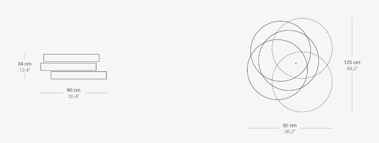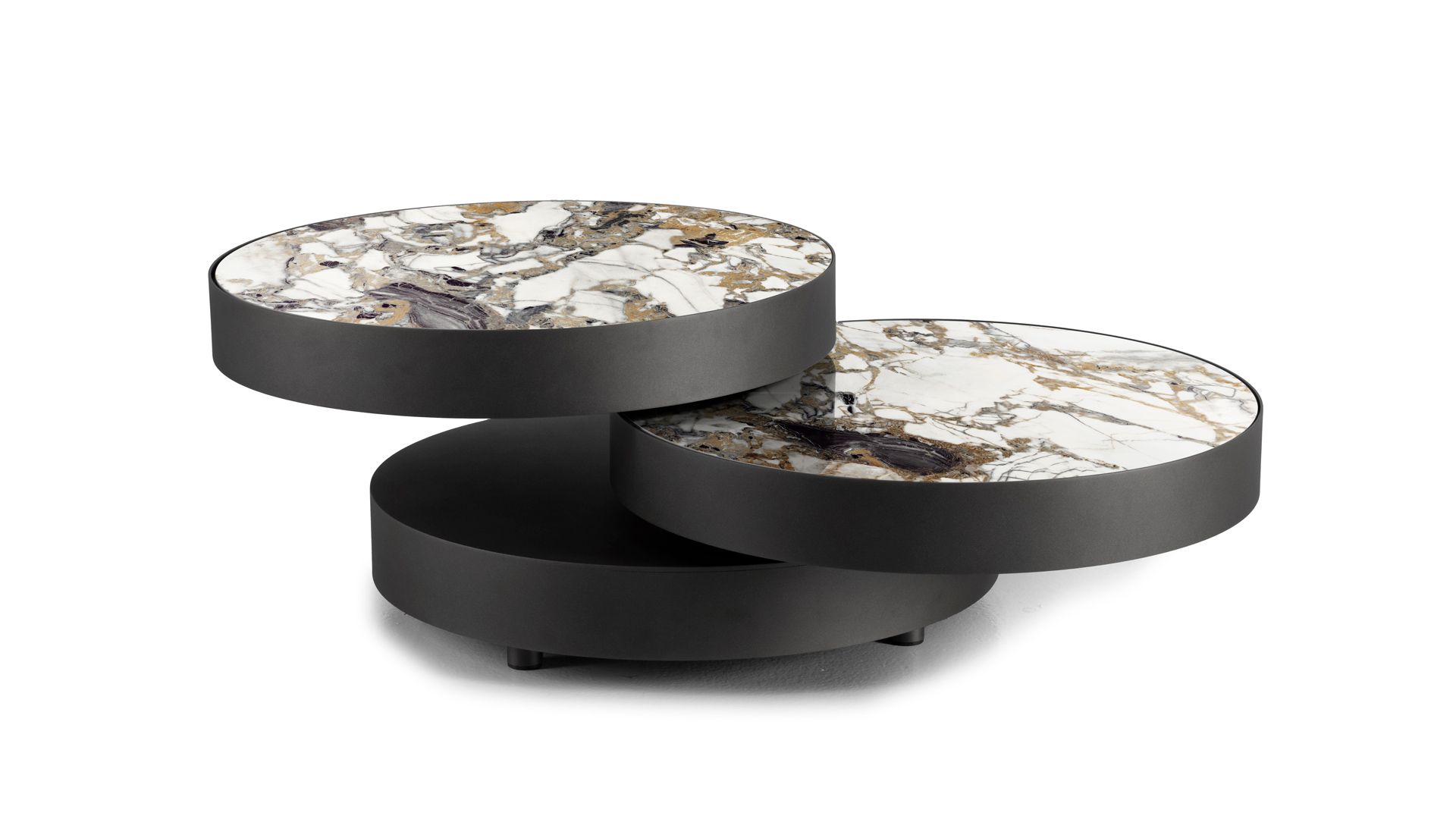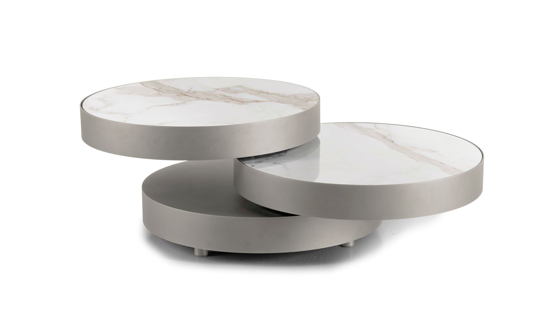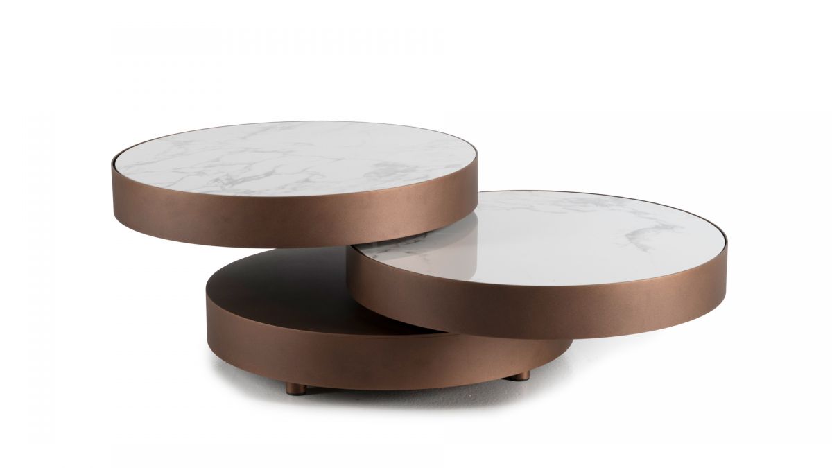 Designerski włoski stolik kawowy AURUM ROUND - stolik o ciekawym designie; stolik z trzema obrotowymi blatami okrągłymi; dolny blat metalowy, górny i środkowy z blatem ceramicznym lub marmurowym. Unikalny mechanizm rozkładający.