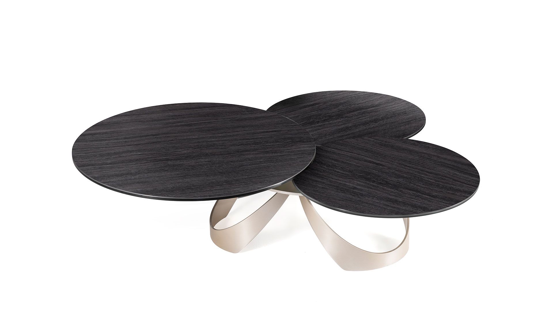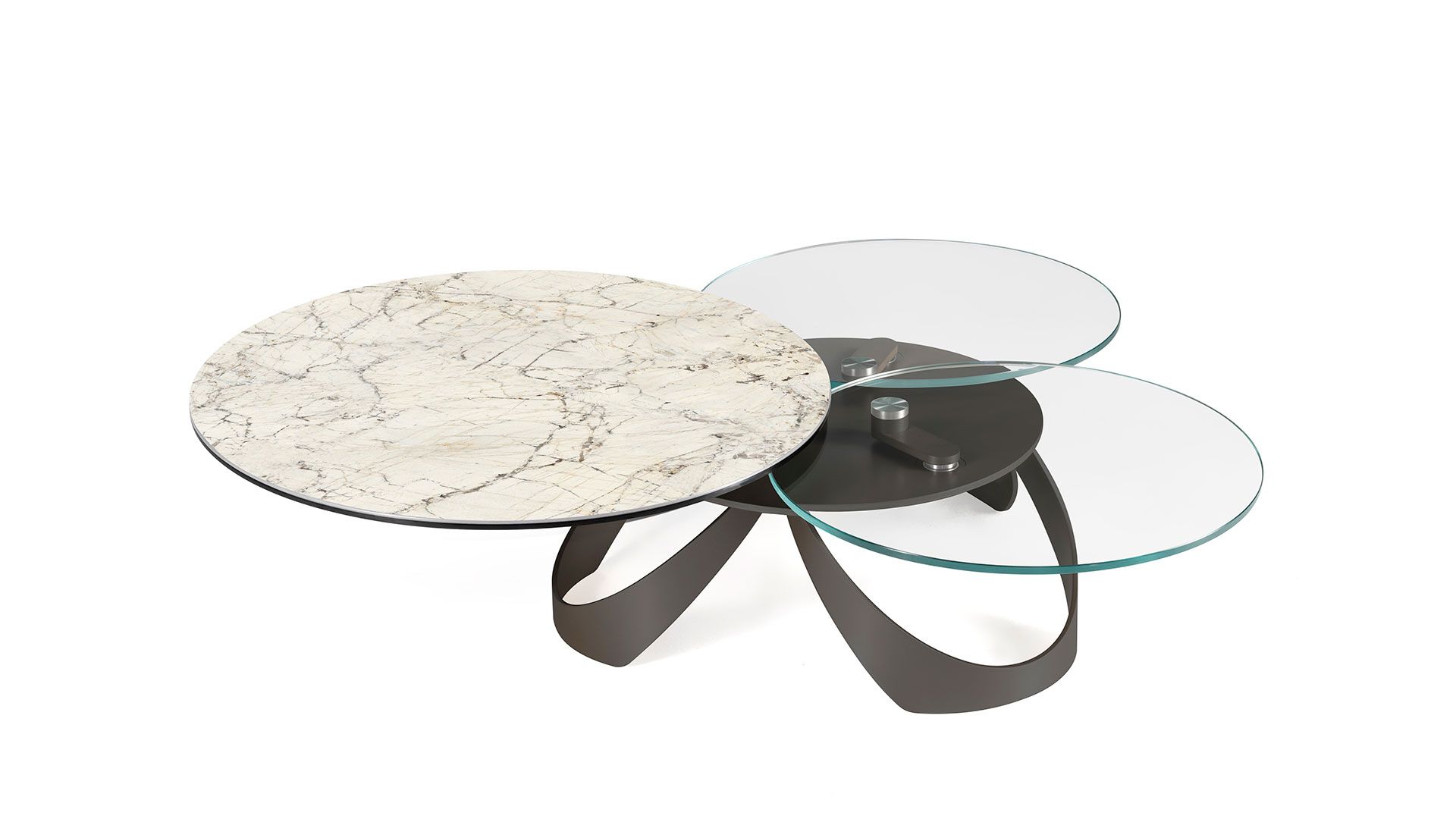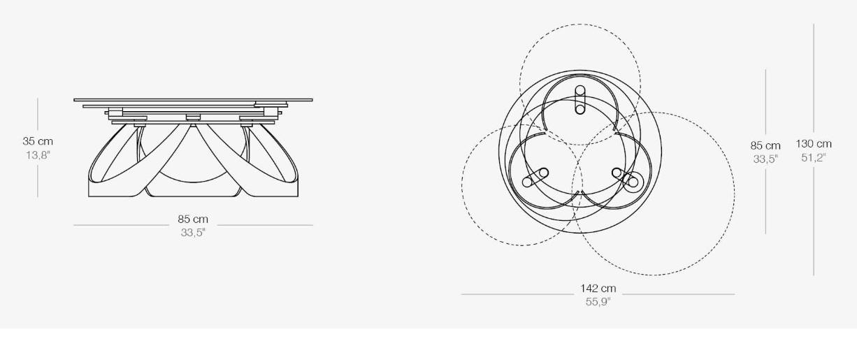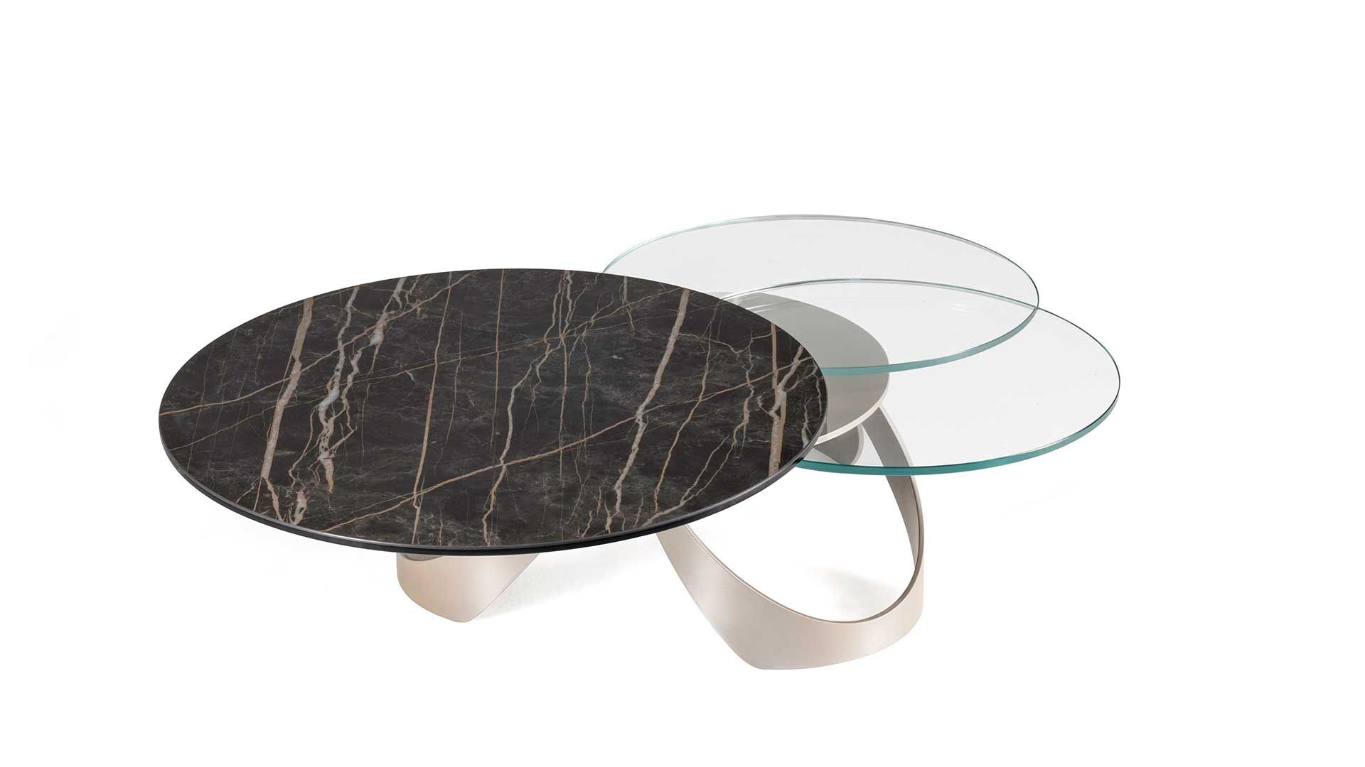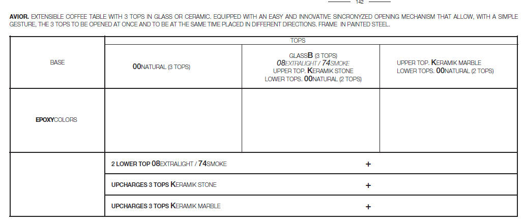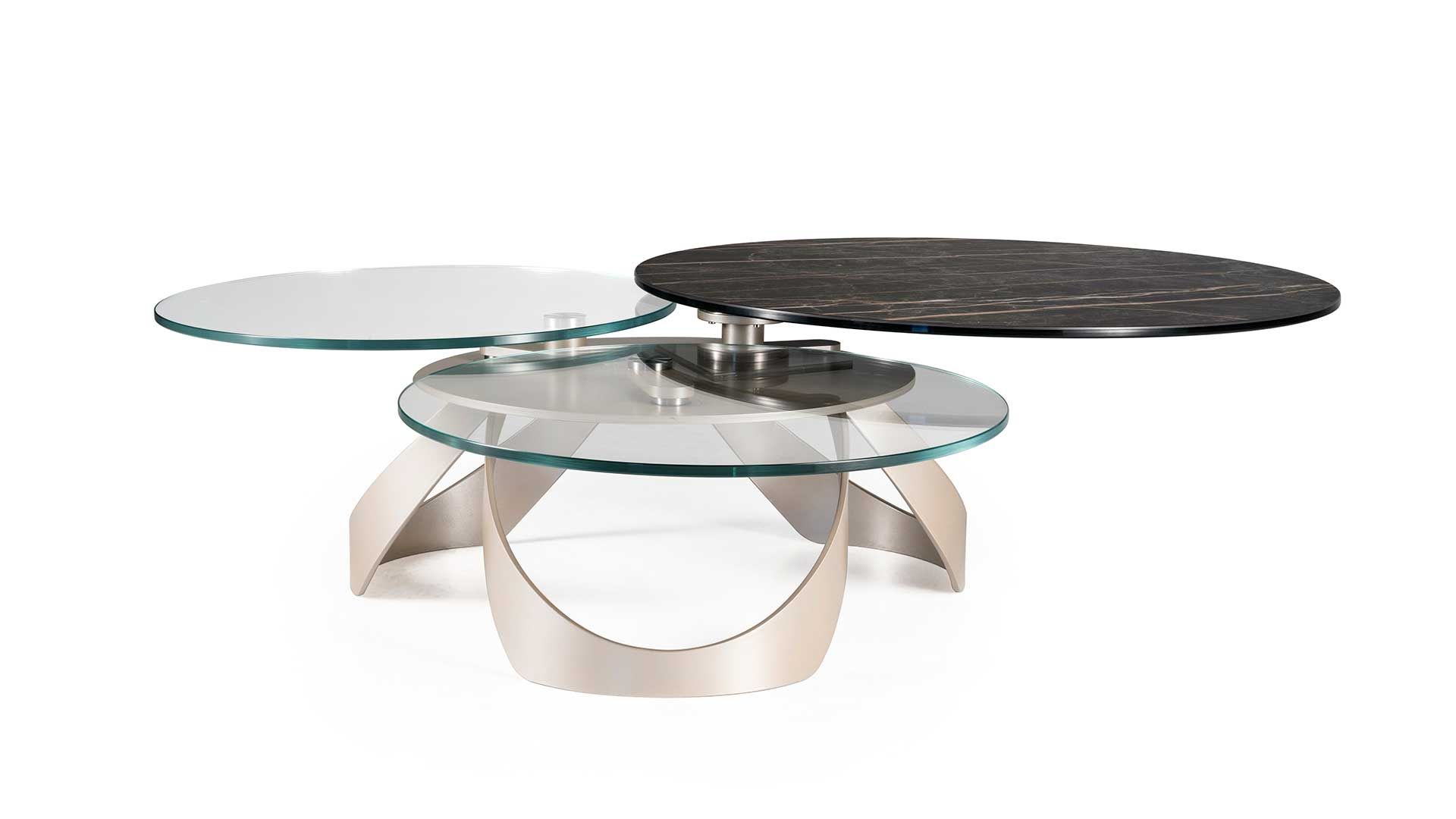 Designerski włoski stolik kawowy AVIOR - stolik o ciekawym designie; podstawa metalowa; blaty szkło lub ceramiczne. Unikalny mechanizm rozkładający. W podstawie ukryte kółka ułatwiające przesuwanie.