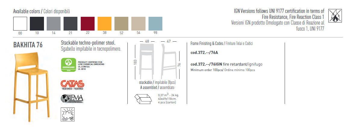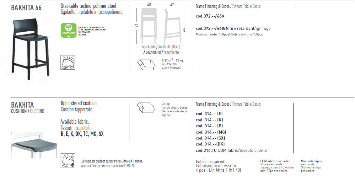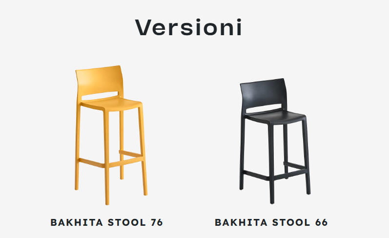 Hoker BAKHITA wykonane w całości z technopolymeru. Hokery posiadają atest CATAS. Hokery można sztaplować. Dostępne dwie wysokości hokera. Hokery można użytkować również na zewnątrz.