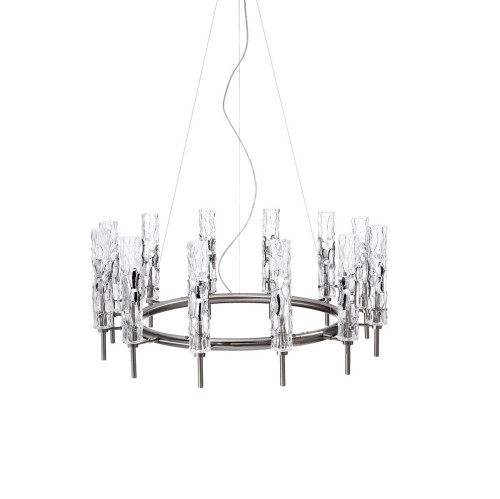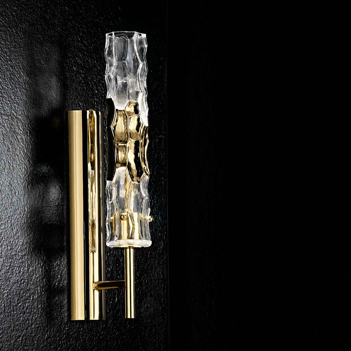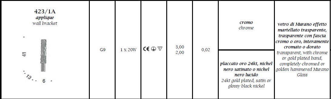 Kinkiet BAMBOO 423/1A - elegancka, stylizowana lampa doskonała zarówno do nowoczesnych jak i klasycznych wnętrz; konstrukcja metalowa dostępna w czterech kolorach, klosze ze szkła Murano z efektem młotkowania dostępne w czterech wariantach kolorystycznych; specyfikacja produktu poniżej; oryginalny produkt włoski.