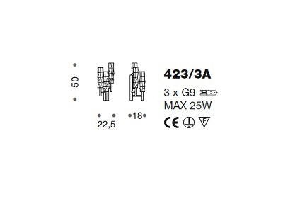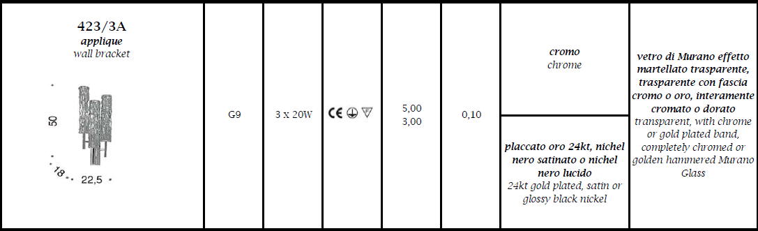Kinkiet BAMBOO 423/3A - elegancka, stylizowana lampa doskonała zarówno do nowoczesnych jak i klasycznych wnętrz; konstrukcja metalowa dostępna w czterech kolorach, klosze ze szkła Murano z efektem młotkowania dostępne w czterech wariantach kolorystycznych; specyfikacja produktu poniżej; oryginalny produkt włoski.