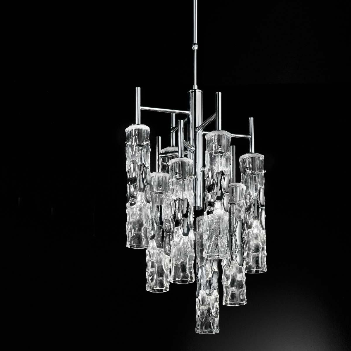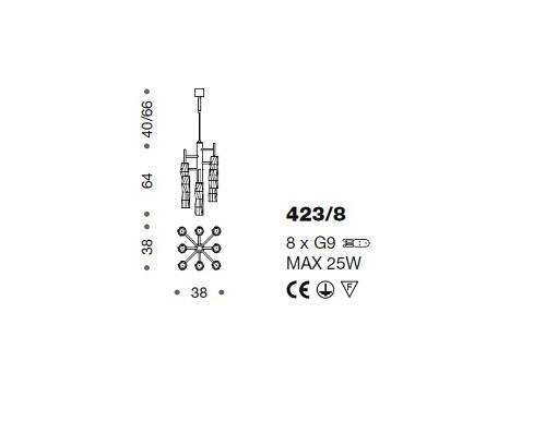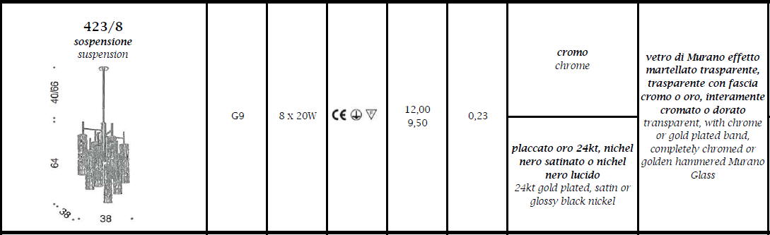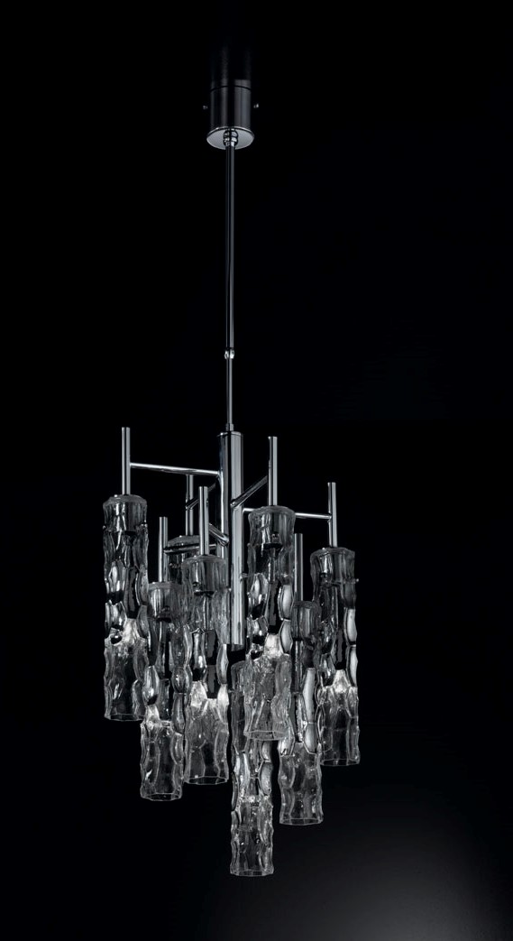 Lampa wisząca BAMBOO 423/8 - elegancka, stylizowana lampa doskonała zarówno do nowoczesnych jak i klasycznych wnętrz; konstrukcja metalowa dostępna w czterech kolorach, klosze ze szkła Murano z efektem młotkowania dostępne w czterech wariantach kolorystycznych; specyfikacja produktu poniżej; oryginalny produkt włoski.