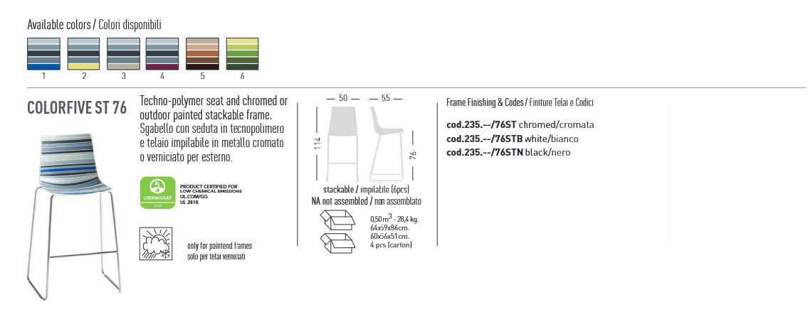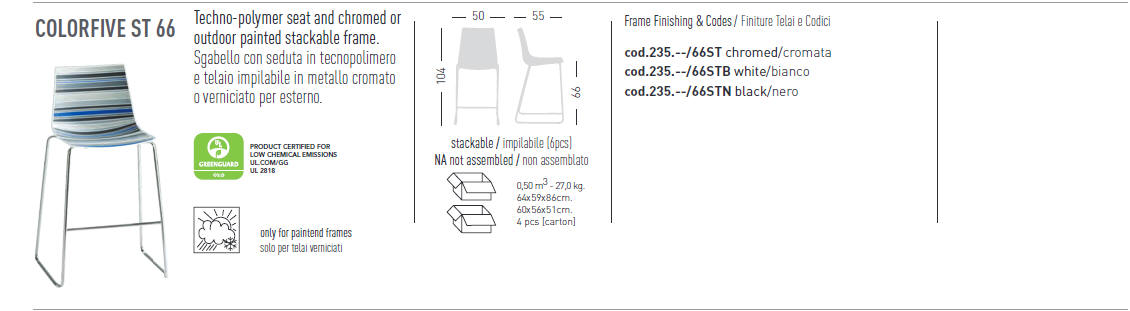 Hoker COLORFIVE połączenie podstawy, wykonanej z metalu lakierowanego lub chromowanego z siedziskiem z technopolymeru w ciekawym zestawie kolorów. Dostępna również wersja z tapicerowanym siedziskiem. Dokładne wymiary na zdjęciu w galerii. Hoker przeznaczony do użytku we wnętrzach a kilka wariantów również na zewnątrz; doskonałe do restauracji. Hokery można sztaplować.