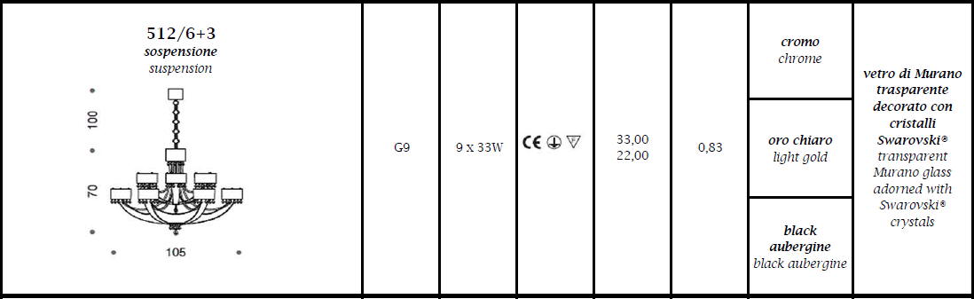 Lampa CRYSTAL BLADE 512/6+3 - wisząca, dekoracyjna lampa; efektowna i niepowtarzalna dostępna w kilku wariantach kolorystycznych; specyfikacja produktu poniżej; oryginalny produkt włoski.