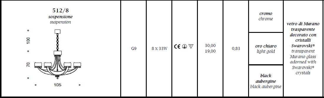 Lampa CRYSTAL BLADE 512/8 - wisząca, dekoracyjna lampa; efektowna i niepowtarzalna dostępna w kilku wariantach kolorystycznych; specyfikacja produktu poniżej; oryginalny produkt włoski.