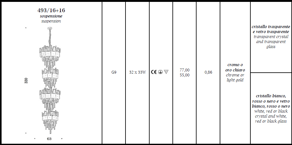 Lampa wisząca, żyrandol 493/16+16 z kolekcji Lude da Vivere z serii CRYSTALLINE dostępna w kilku wariantach kolorystycznych.