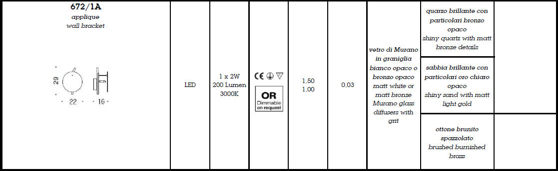 Kinkiet DP 672/1A - linia lamp DP łączy w sobie szkło Murano ze światłem LED. Kolekcja jest dostępna w następujących kombinacjach kolorystycznych: