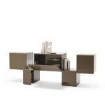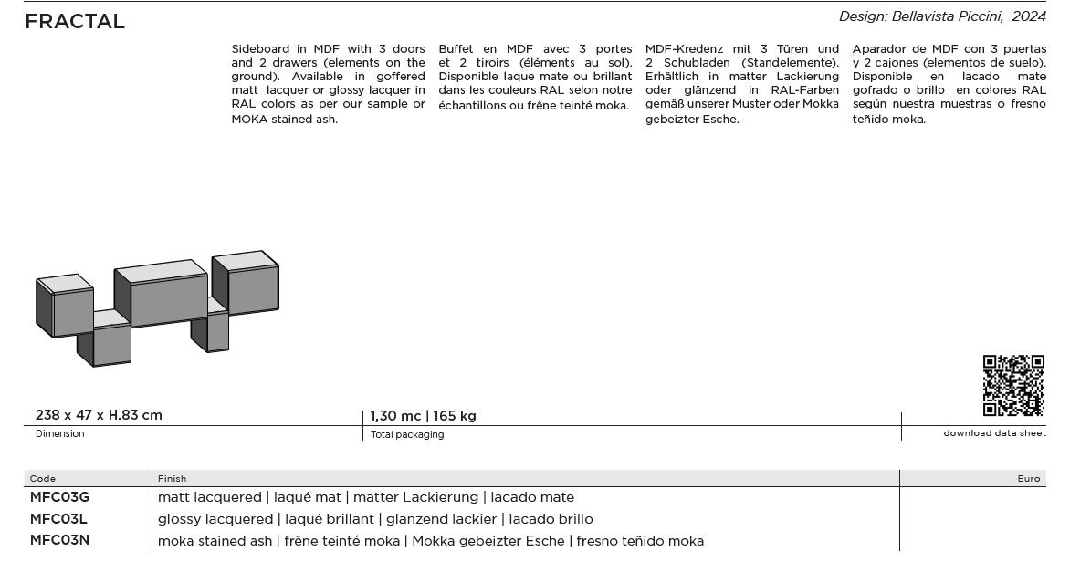 Komoda FRACTAL - komoda wykonana MDF-u lakierowanego wg palety RAL wykończenie matowe lub z połyskiem; dostępna również wersja z fornirem w kolorze moka; wyposażona w 2 szuflady (elementy stojące na ziemi) i 3 drzwiczkami; dostępna również szafka RTV.