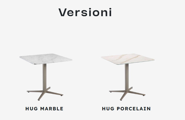 Stoły HUG marbel - stoły dedykowane do użytku komercyjnego lub indywidualnego; niewielkie stoły kawiarniane, restauracyjne jak i ogrodowe; do wyboru kilka rozmiarów blatów; blaty marmurowe lub ceramiczne. Niektóre warianty można użytkować na zewnątrz.
