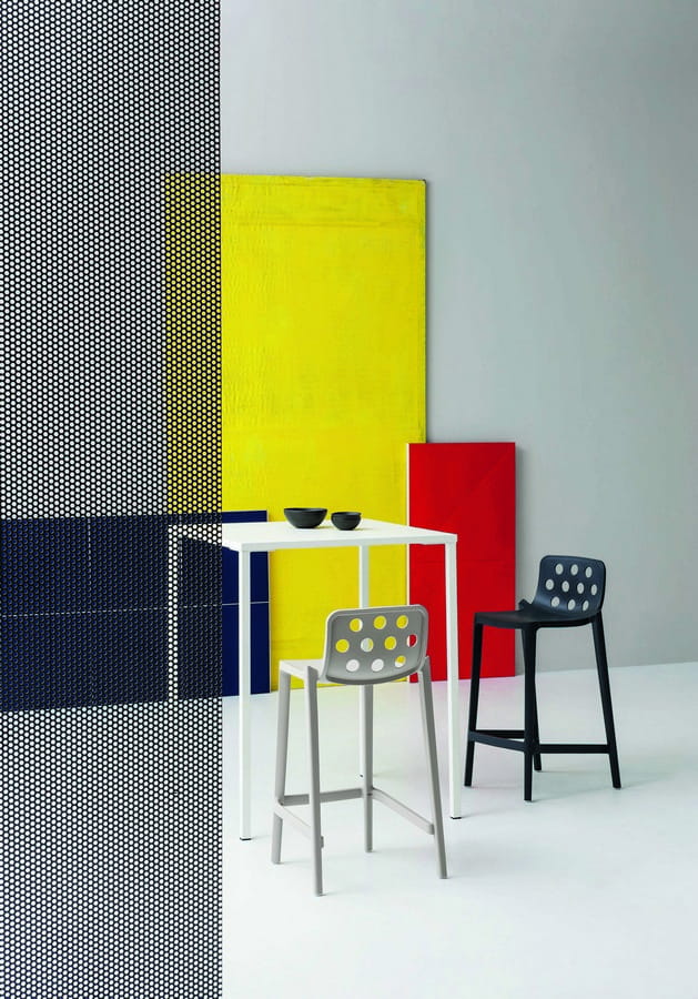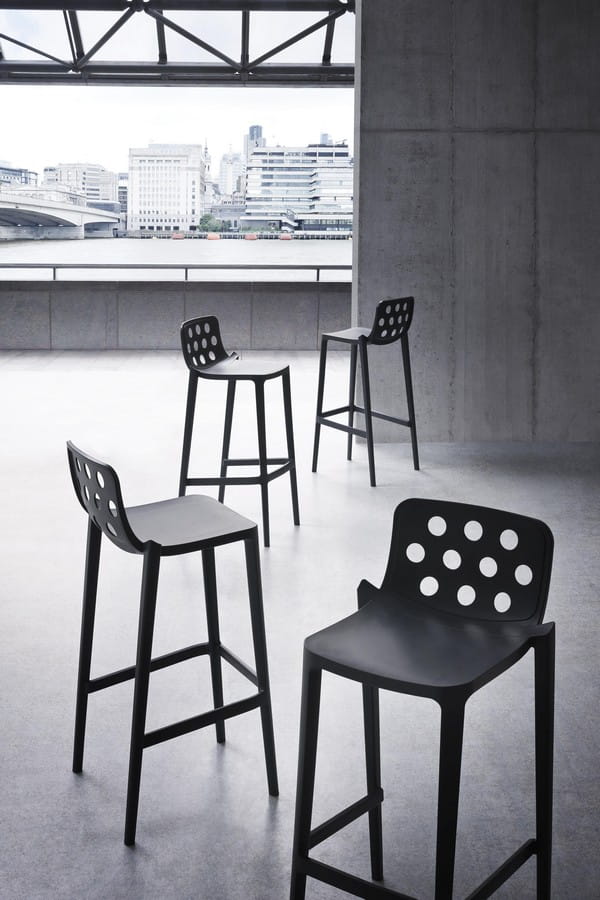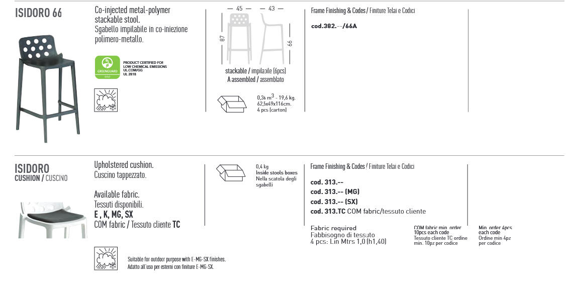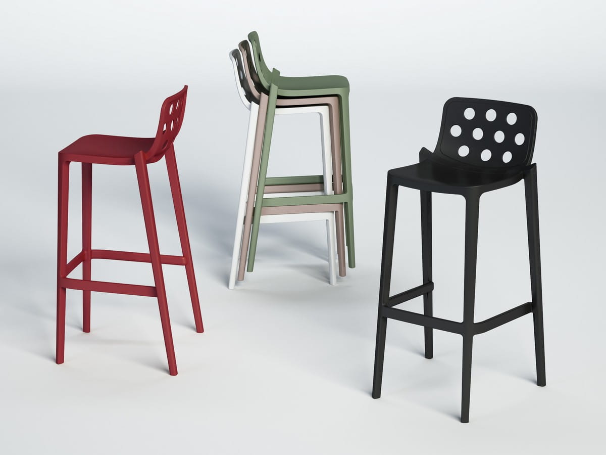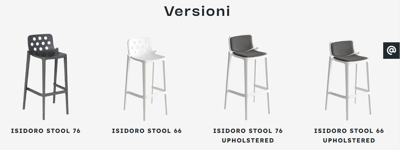 Hoker ISIDORO - hokery dostępne w dwóch wysokościach; zależnie od modelu wykonane w całości z techno-polimeru (tą wersję można wyposażyć w poduszkę na siedzisko); lub wykonane z technoplimeru połączone z oparciem wykończonym z tyłu z połyskiem, z tapicerowanym oparciem i siedziskiem.