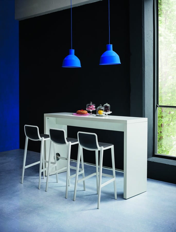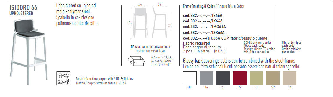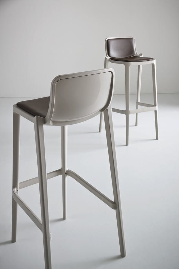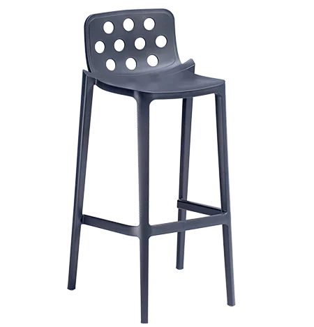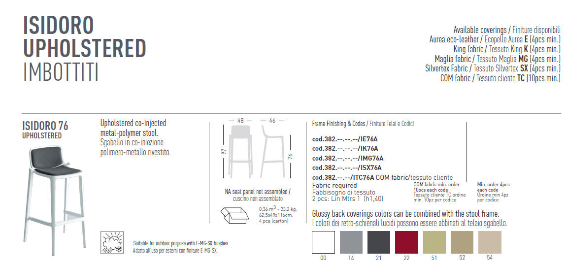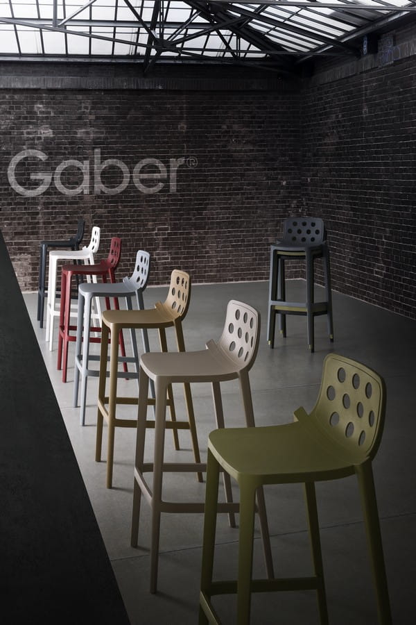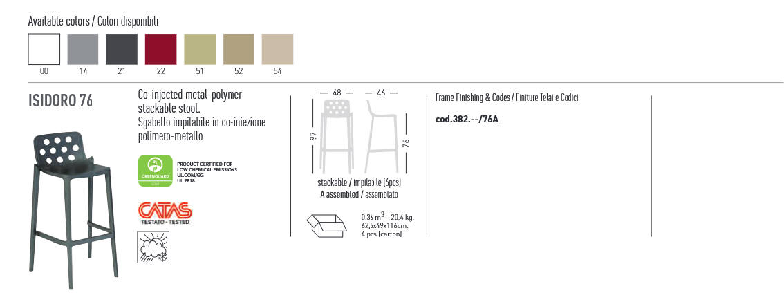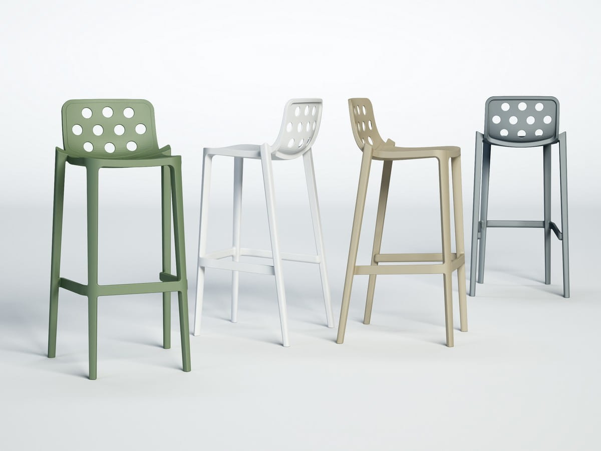 Hoker ISIDORO - hokery dostępne w dwóch wysokościach; zależnie od modelu wykonane w całości z techno-polimeru (tą wersję można wyposażyć w poduszkę na siedzisko); lub wykonane z technoplimeru połączone z oparciem wykończonym z tyłu z połyskiem, z tapicerowanym oparciem i siedziskiem.