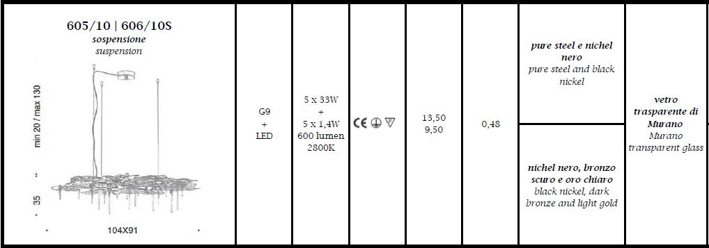 Lampa wisząca, żyrandol LEAVES 605/10 - efektowna, unikatowa lampa doskonała do nowoczesnych wnętrz; konstrukcja metalowa dostępna w czterech kolorach, dekoracje ze szkła Murano; specyfikacja produktu poniżej; oryginalny produkt włoski.