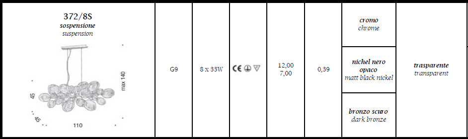 Lampa wisząca NUVOLA 372/8S - interesująca seria lamp rama metalowa w trzech kolorach; klosze szklane transparentne lub kolorowe transparentne; specyfikacja produktu poniżej; oryginalny produkt włoski.