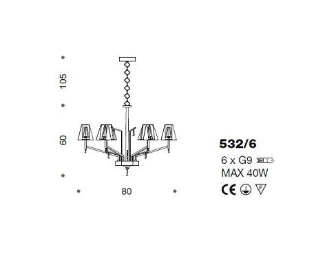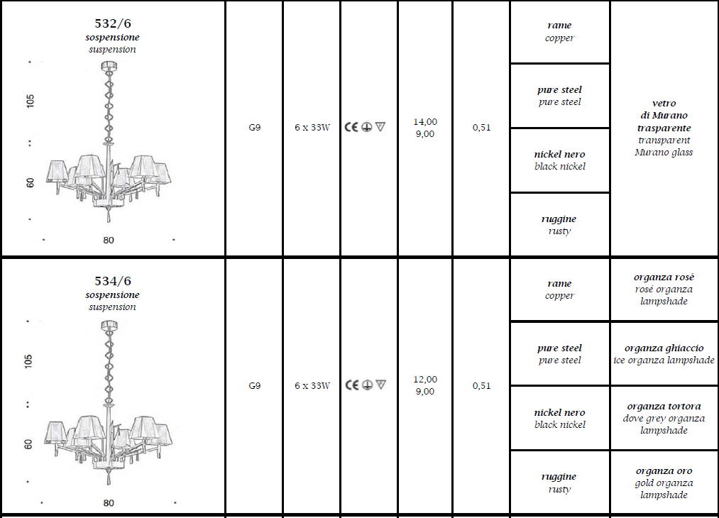 Lampa wisząca, żyrandol PRESTIGE 532/6, 534/6 - lampa o klasycznym kształcie w nowoczesnej odsłonie; rama wykonana z metalu; lampa dostępna w dwóch wykończeniach: model 532 - klosze połączenie metalu i szkła; model 534 - klosze połączenie metalu i organzy; efektowna i niepowtarzalna dostępna w kilku wariantach kolorystycznych; specyfikacja produktu poniżej; oryginalny produkt włoski.