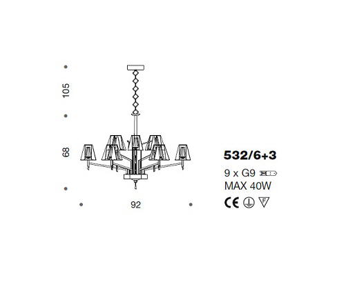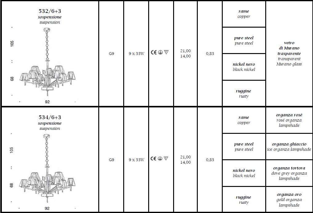 Lampa wisząca, żyrandol PRESTIGE 532/6+3, 534/6+3 - lampa o klasycznym kształcie w nowoczesnej odsłonie; rama wykonana z metalu; lampa dostępna w dwóch wykończeniach: model 532 - klosze połączenie metalu i szkła; model 534 - klosze połączenie metalu i organzy; efektowna i niepowtarzalna dostępna w kilku wariantach kolorystycznych; specyfikacja produktu poniżej; oryginalny produkt włoski.