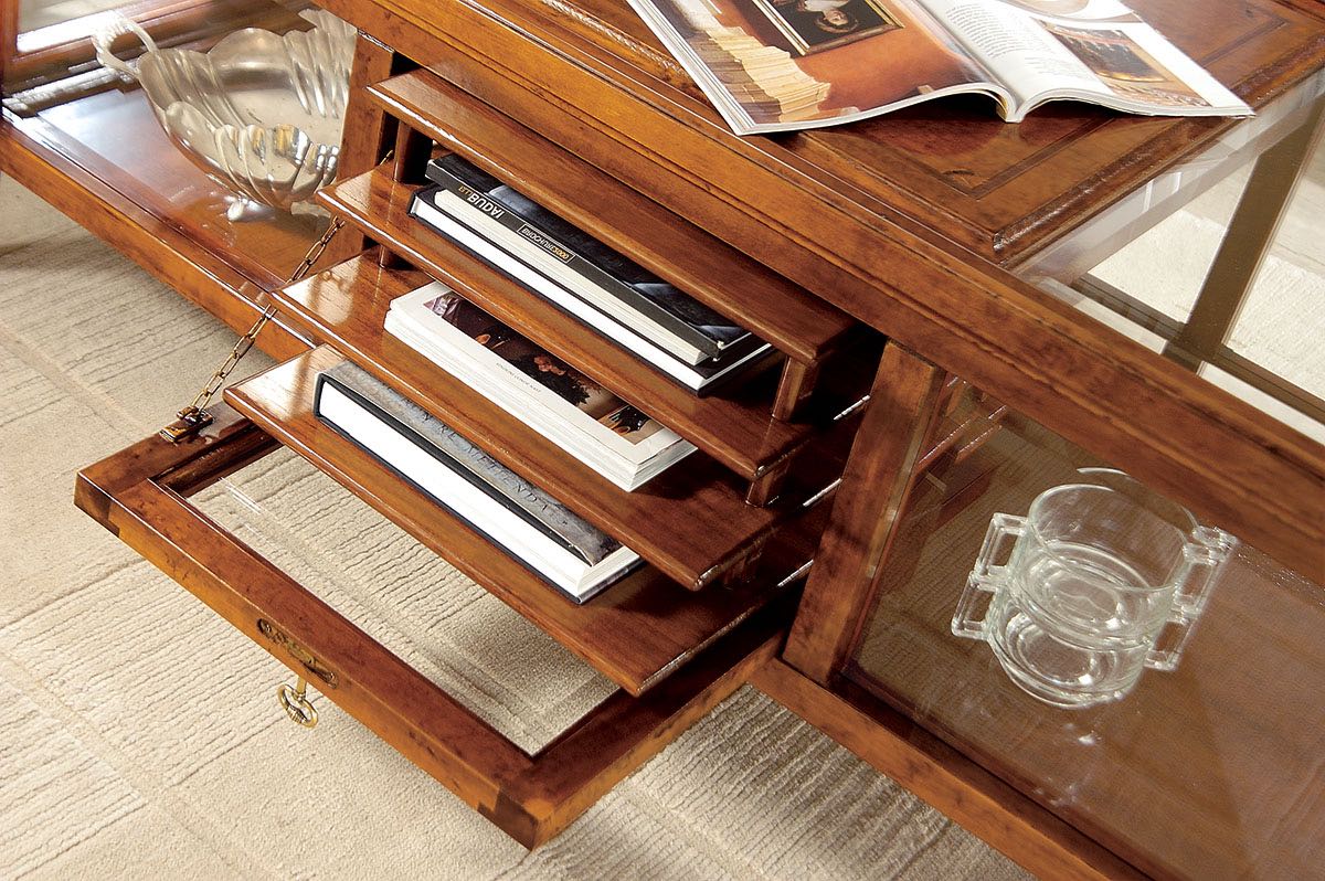 Ława stylizowana model 22.27; wykonana z drewna; ława wyposażona w podręczną półkę; szklane blaty boczne i wysuwaną wygodną szufladę z półkami na dokumenty lub czasopisma; pod blatem wygodne schowki; najwyższa jakość wykonania; stolik dostępny w wielu kolorach drewna;