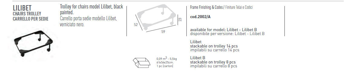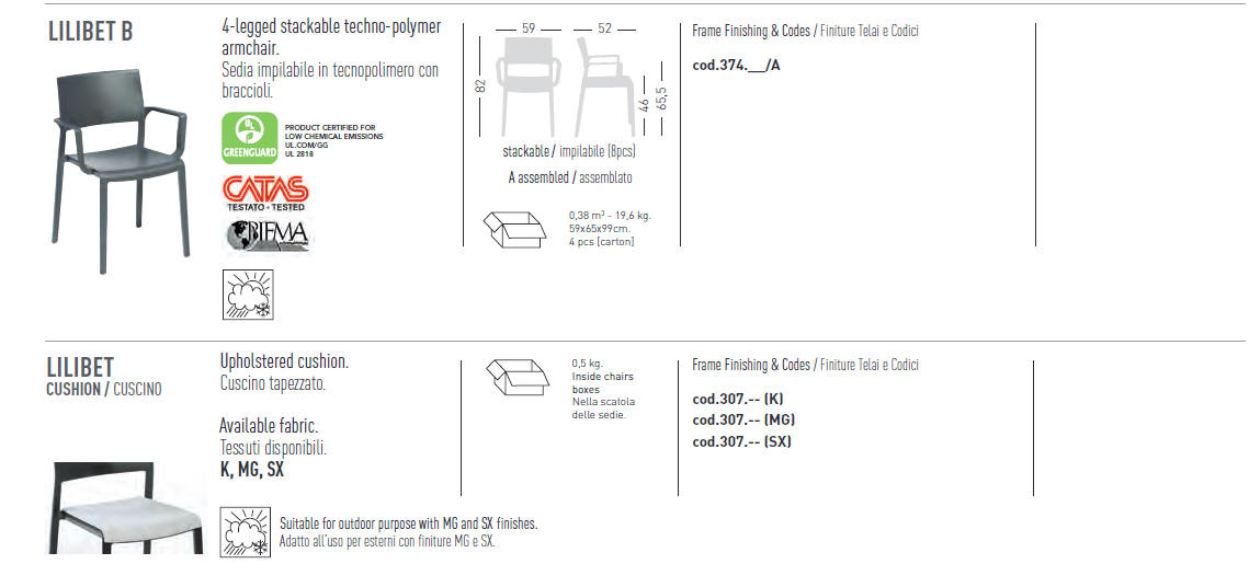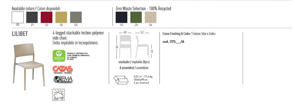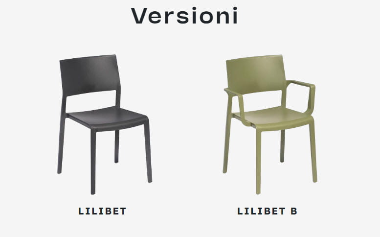 Krzesło LILIBET - krzesło dostępne w wielu kolorach, wykonane w całości z techno-polimeru. Dostępny model z podłokietnikami lub bez. Krzesła można sztaplować. Wersja bez podłokietników posiada atest CATAS. Krzesła można wyposażyć w poduszkę na siedzisko. Dostępny jest również wózek ułatwiający transport krzeseł. Krzesła można również użytkować na zewnatrz.