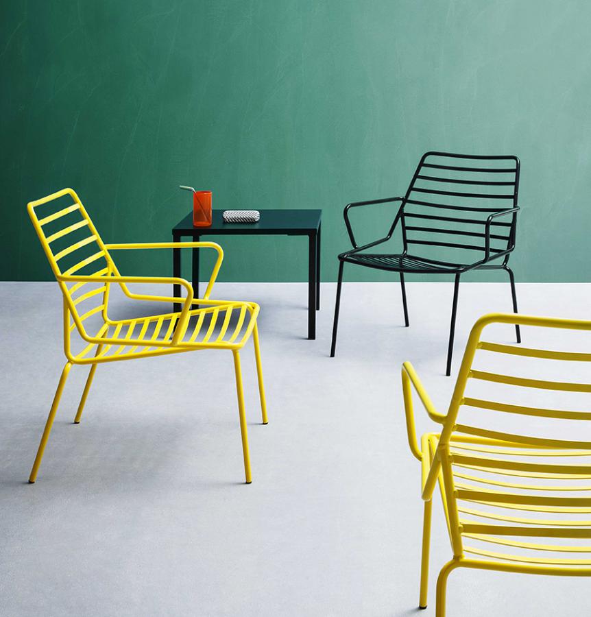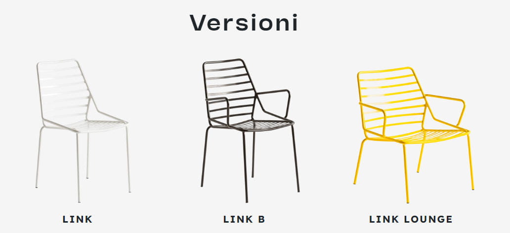 Krzesło LINK - krzesła wykonane w całości z metalu lakierowanego na kilka wyrazistych kolorów. Dostępne są krzesła z podłokietnikami lub bez. Krzesła bez podłokietników posiada atest CATAS. Krzesła można wyposażyć w poduszkę na siedzisko lub na całość (oparcie i siedzisko). W linii Link dostępny jest również fotel, leżak i stolik.