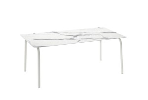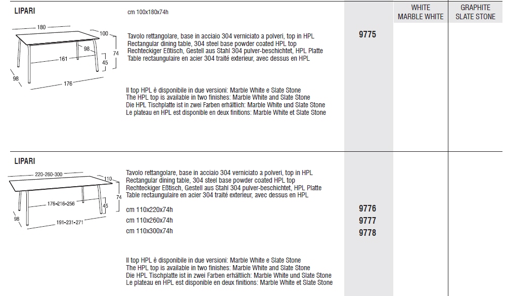 Stół ogrodowy LIPARI - włoskiej marki Roberti. Stoły można użytkować zarówno we wnętrzach jak i na zewnątrz. To doskonałe stoły do ogrodu, czy na taras. Stoły dostępne w czterech rozmiarach i dwóch kolorach. Podstawa metalowa w kolorze białym lub graphit, blat z tworzywa HPL w kolorze marble white lub slate stone.