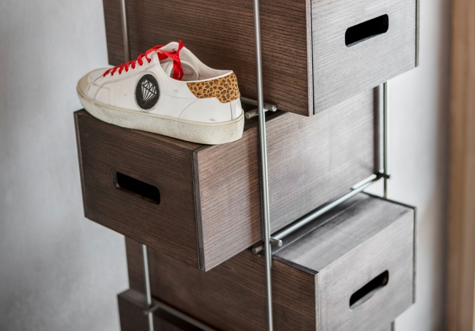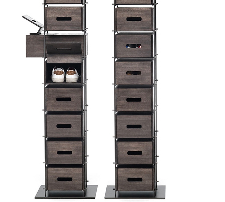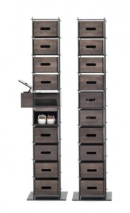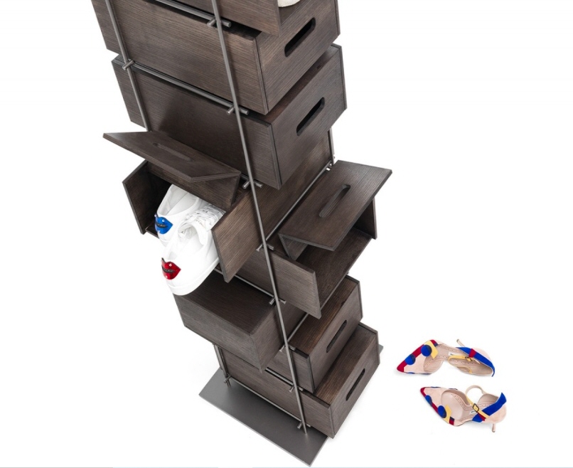 Regał włoski MANOLO - interesujący regał do nowoczesnych wnętrz jak również do wnętrz w stylu industrialnym. Metalowa konstrukcja na której wsparte są wyjmowane, wygodne i pojemne drewniane szuflady. Regał doskonale sprawdzi się jako szafka na buty.