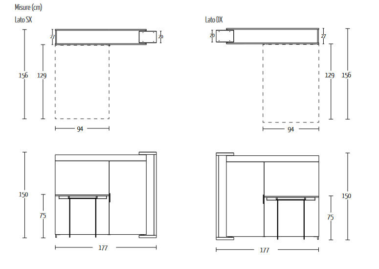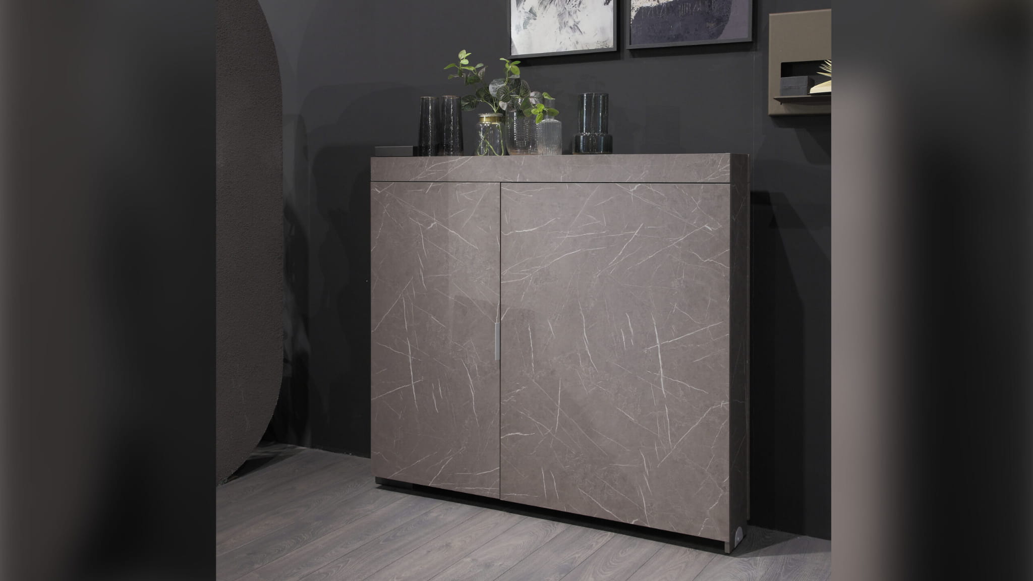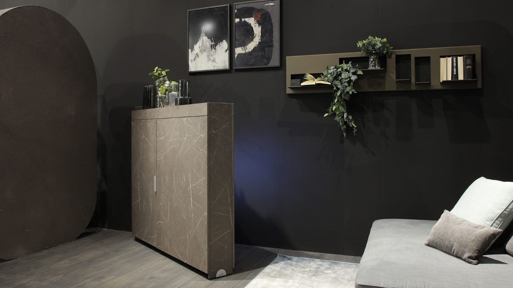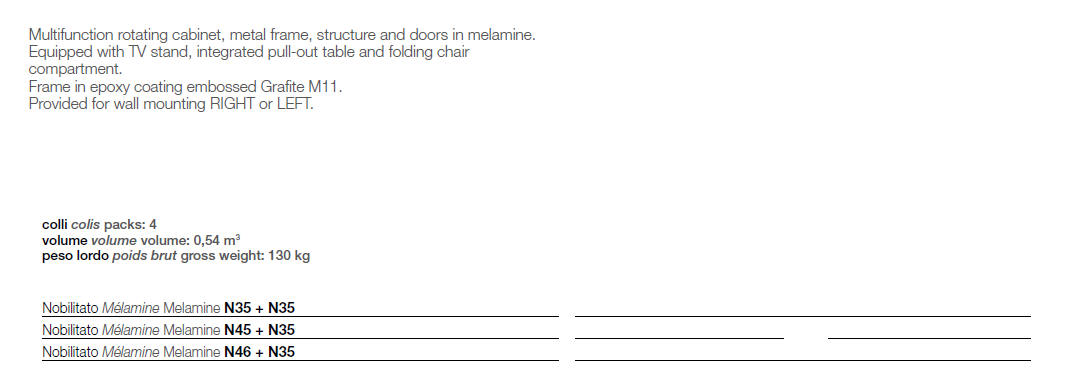 Nowoczesny włoski mebel multifunkcyjny TWIST - mebel obrotowy; z jednej strony znajduje się szafka RTV, z drugiej składany stolik i schowek na składane krzesła (krzesła nie znajdują się w zestawie). Mebel występuje w trzech wariantach kolorystycznych. Doskonałe rozwiązanie do niewielkich wnętrz.