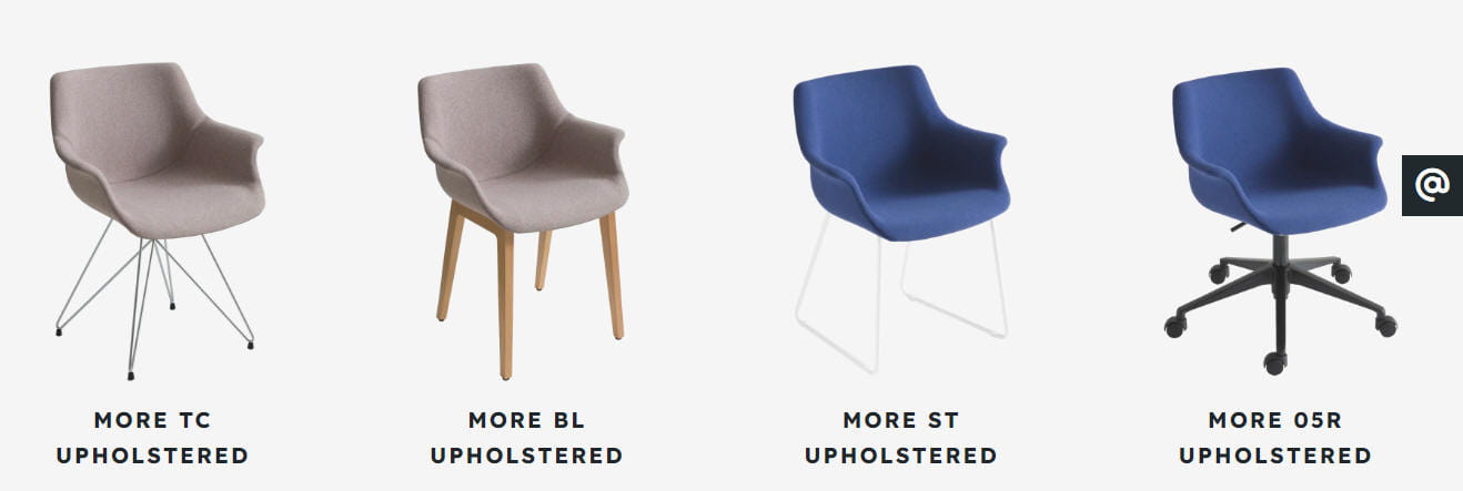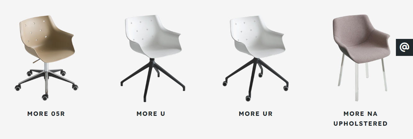 Krzesło MORE - duża gama krzeseł z wygodnym, kubełkowym siedziskiem. Podstawa metalowa w kilku wariantach, drewniana. Dostępne również podstawy obrotowe na kółkach i stelażu. Kilka wersji można użytkować również na zewnątrz. Siedzisko wykonane z technopolimeru dodatkowo można wyposażyć w wygodną poduszkę. Dostępne również siedzisko tapicerowane w szerokiej gamie tkanin i skór. Ciekawa propozycja na kompleksowe wyposażenie wnętrz komercyjnych.