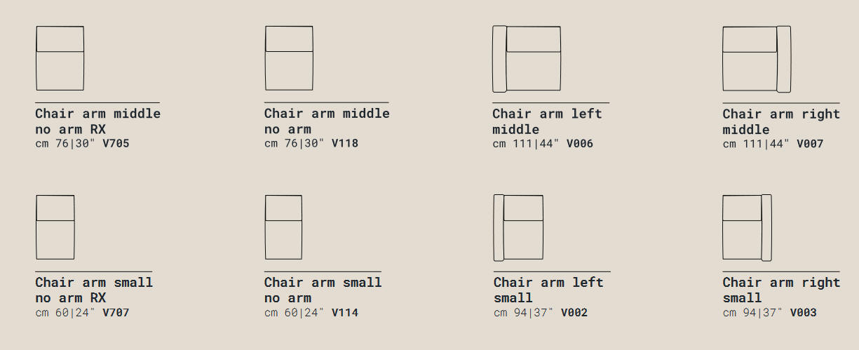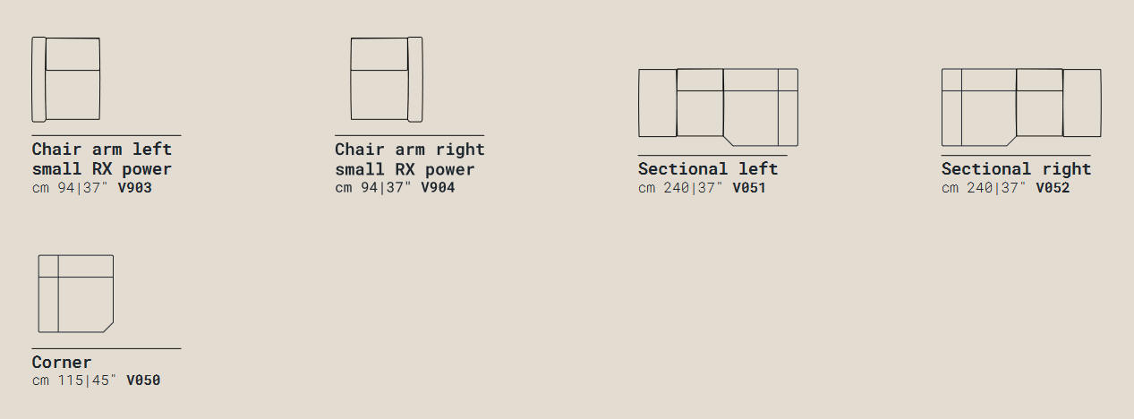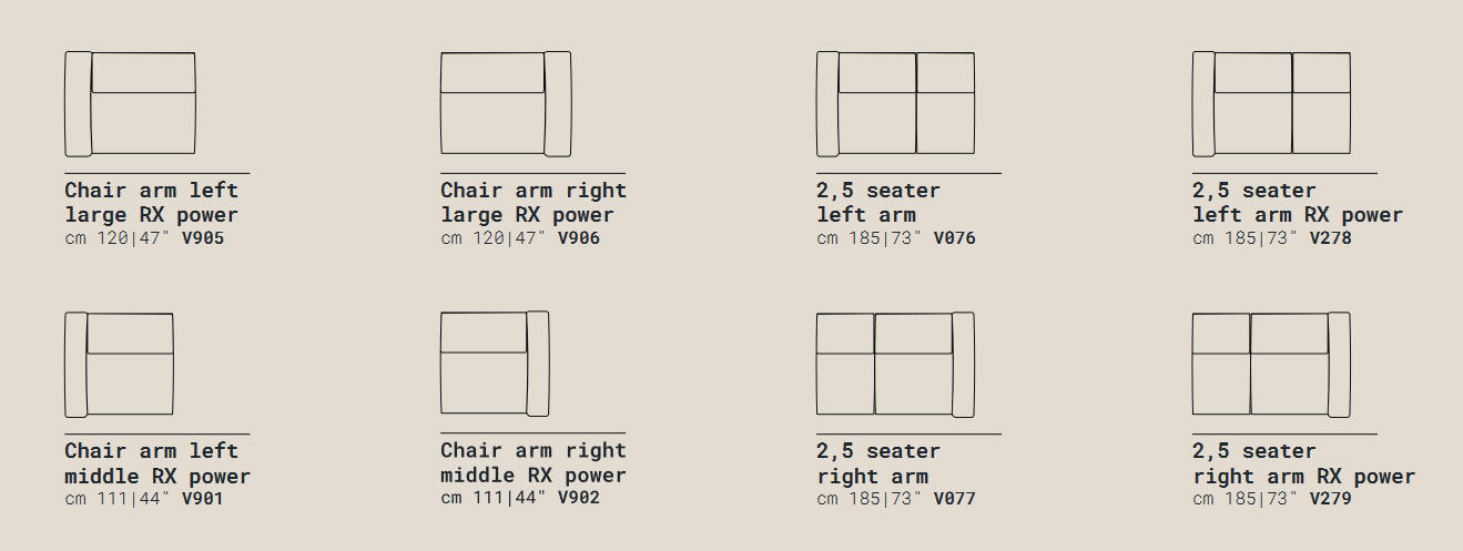 Narożniki wypoczynkowe, zestawy z systemu MODO (I 858); w systemie dostępne są sofy w kilku rozmiarach, elementy boczne, elementy środkowe, moduły w różnych rozmiarach, element narożny i fotele. Część elementów jest wyposażonych w funkcję relax (RX). Meble dostępne są w wielu tkaninach i skórach naturalnych. Mnogość dostępnych brył daje szerokie możliwości skomponowania zestawu jak najlepiej dopasowanego do wnętrza i potrzeb.