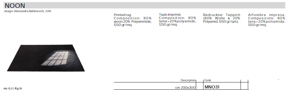 Dywan włoski NOON - dywan o wyjątkowym designie, dla ceniących niebagatelny design; wymiary dywanu 200x300; skład: 80% wool + 20% Polyammide; 1250 gr/mq. Dzięki użytej kolorystyce dywan daje złudzenie ciekawego efektu wpuszczania światła przez okno.