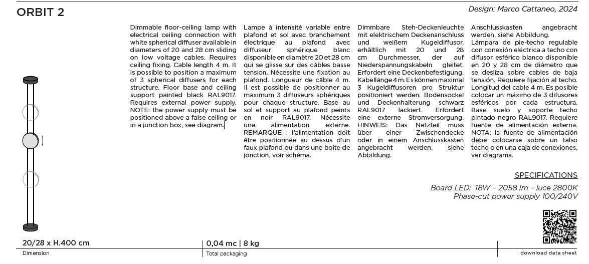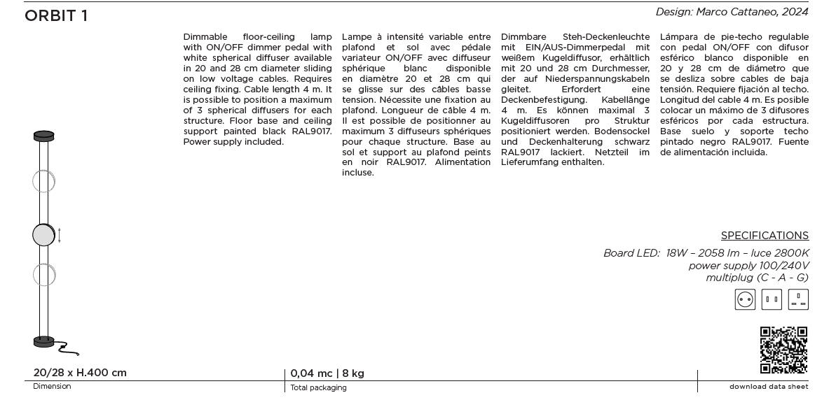 Lampa podłogowo-sufitowa ORBIT - interesująca propozycja oświetlenia; 1 moduł składa się z mocowania do sufitu i podłogi, linki o długości 4 m, ściemniacza; dyfuzory światła okrągłe dostępne w dwóch rozmiarach; maksymalnie na jednym module można zamontować trzy dyfuzory; dostępna dwa warianty z podłączeniem energii z podłogi lub z sufitu. Moduły można łączyć w ciekawe konstrukcje, które ożywią wnętrze. Wysokość dyfuzorów można dowolnie zmieniać. Można również zamówić inną wysokość lampy.