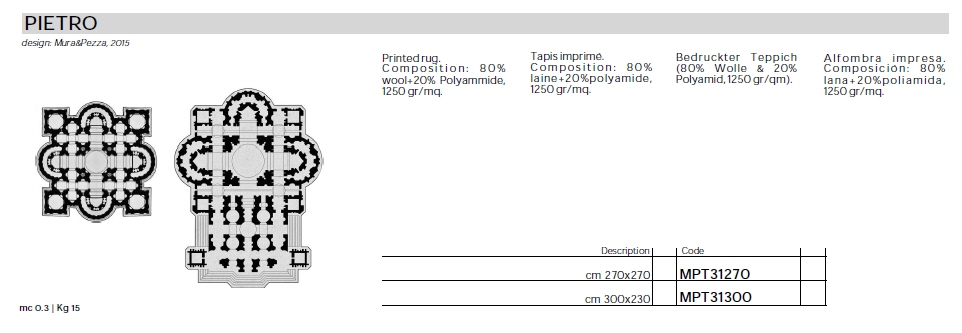 Dywan włoski PIETRO - dywan o wyjątkowym designie, dla ceniących niebagatelny design; wymiary dywanu 270x270 lub 300x230; skład: 80% wool + 20% Polyammide; 1250 gr/mq. Wzór imitujący pałacową posadzkę; ciekawa propozycja w czarnobiałej kolorystyce.