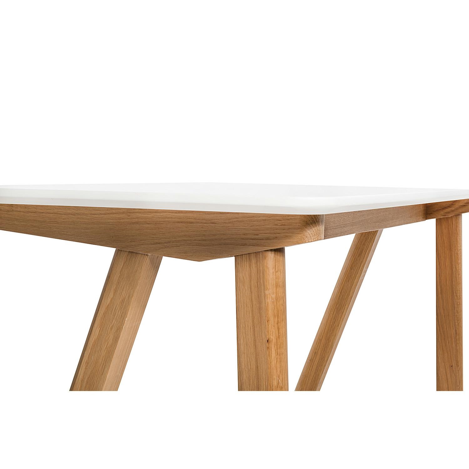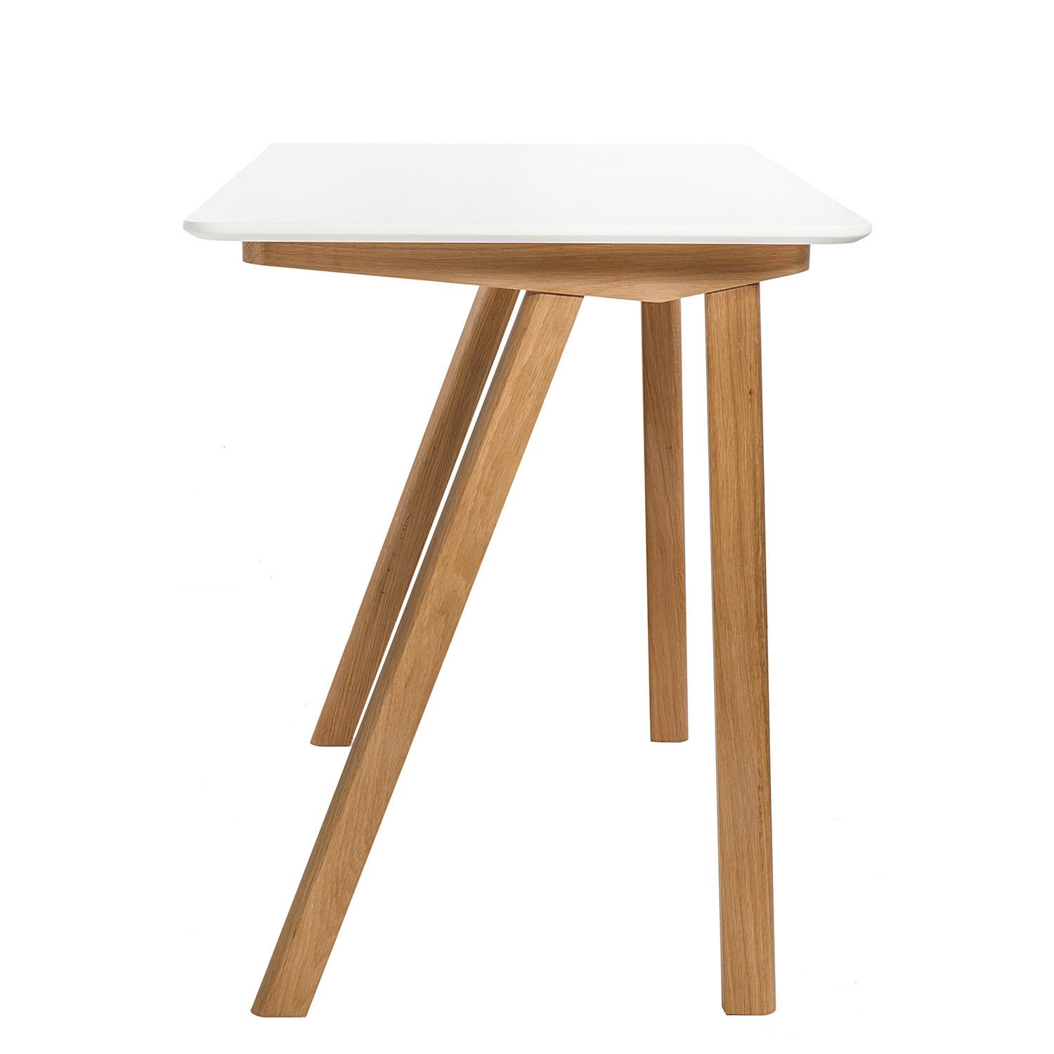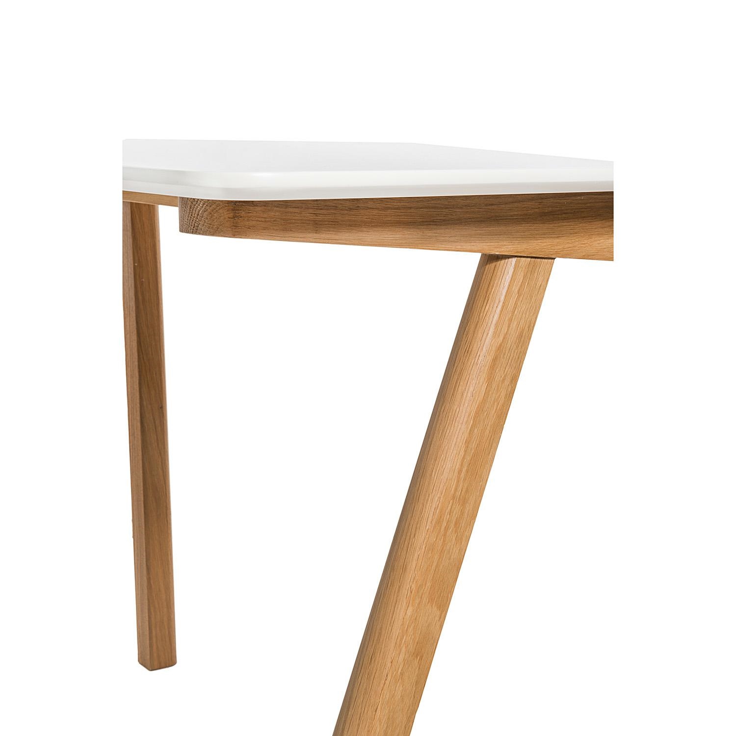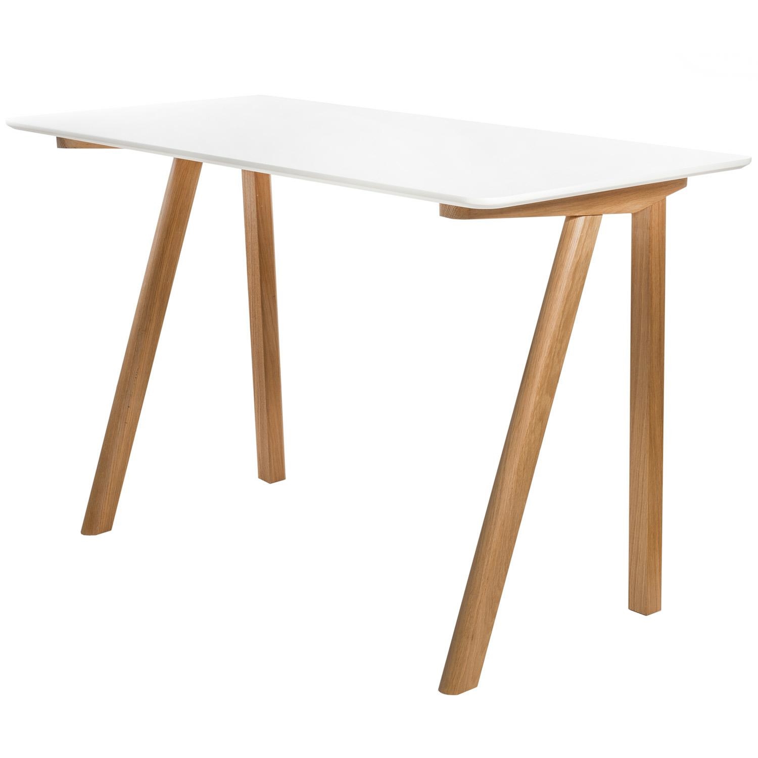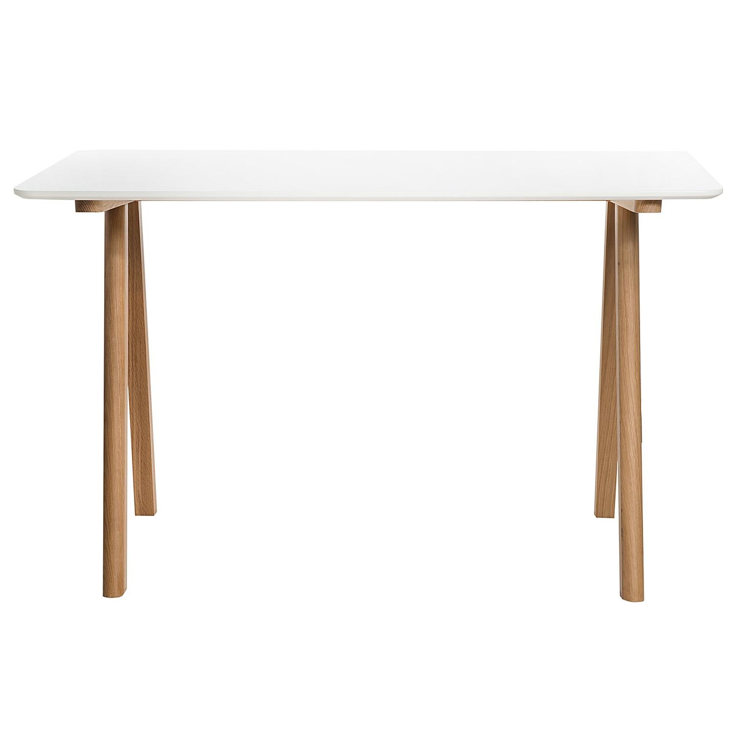 Biurko SIMPLET TUNN; blat biurka biały półmatowy z płyty MDF; podstawa drewniana, dębowa. Biurko doskonałe do wnętrz w stylu skandynawskim.