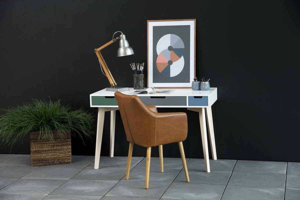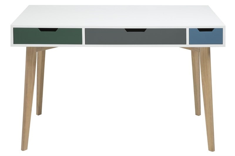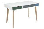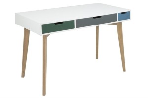Biurko TESS; blat biurka biały z płyty MDF; biurko posiada 3 szuflady w różnych kolorach; podstawa drewniana, z drewna jesionowego. Biurko doskonałe do wnętrz w stylu skandynawskim.
