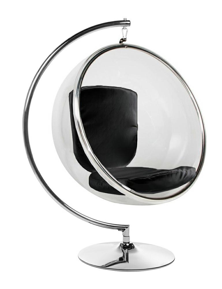 Fotel bujany, huśtawka inspirowany projektem BUBBLE; korpus fotela wykonany z przezroczystego tworzywa sztucznego; poduszka z ekoskóry dostępna w trzech kolorach; fotel zamontowany na dołączonym stojaku metalowym chromowanym.