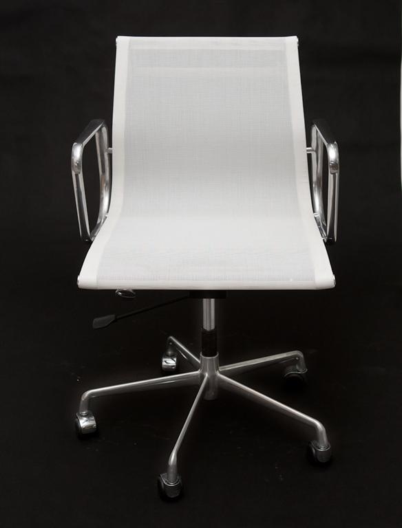 Fotel biurowy inspirowany projektem EA-117; siedzisko wykonane z siateczki z tworzywa sztucznego; podstawa chromowa obrotowa na kółkach z regulacją wysokości;