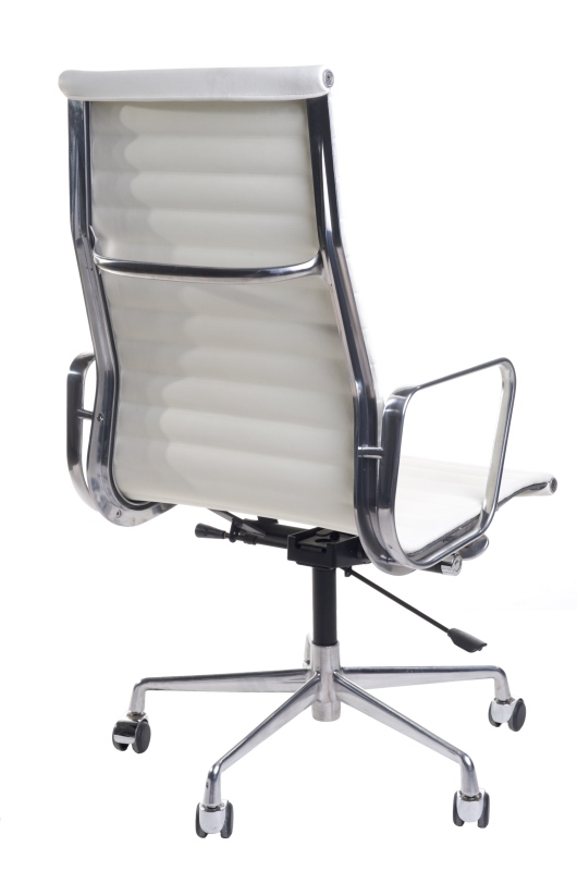 Fotel inspirowany projektem EA-119; siedzisko skóra naturalna w dwóch kolorach; podstawa na kółkach, obrotowa z regulacją wysokości siedziska; chromowana.