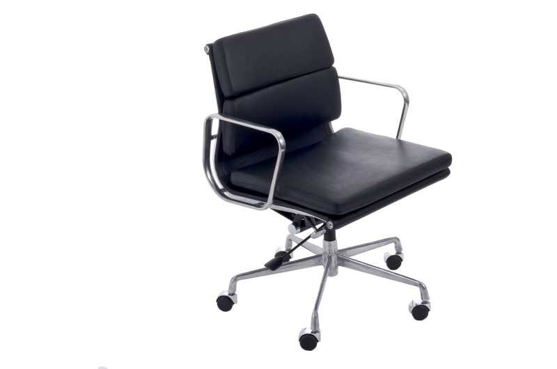 Fotel inspirowany projektem EA-217; siedzisko tapicerowane skórą naturalną w dwóch kolorach; podstawa chromowana na kółkach, obrotowa z regulacją wysokości siedziska;