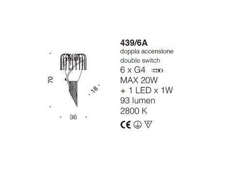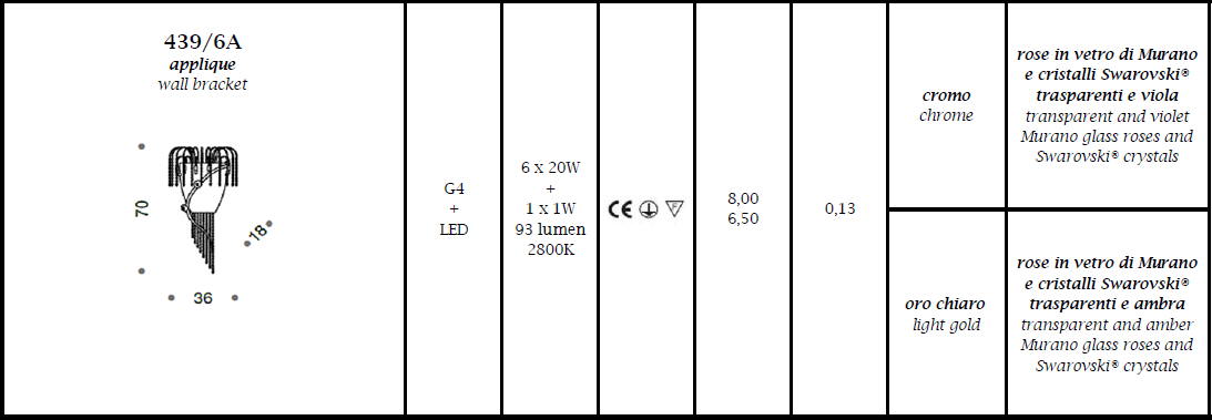 Kinkiet DIVINA 439/6A - dekoracyjna seria lamp połączenie metalu z kryształowymi i szklanymi dekoracjami; specyfikacja produktu poniżej; oryginalny produkt włoski.