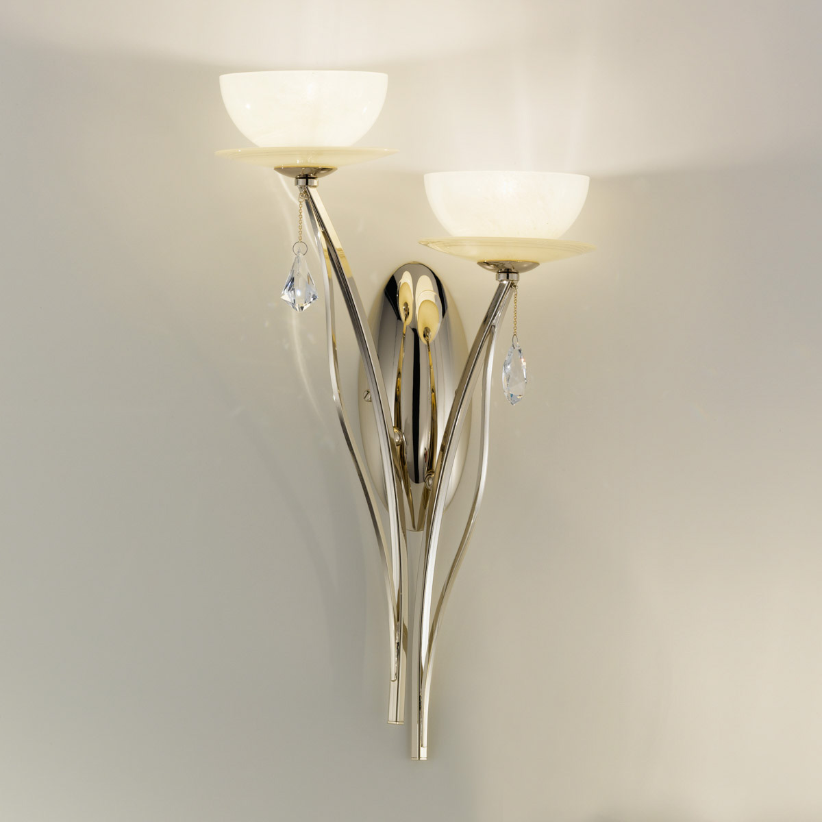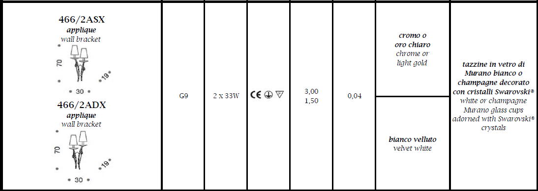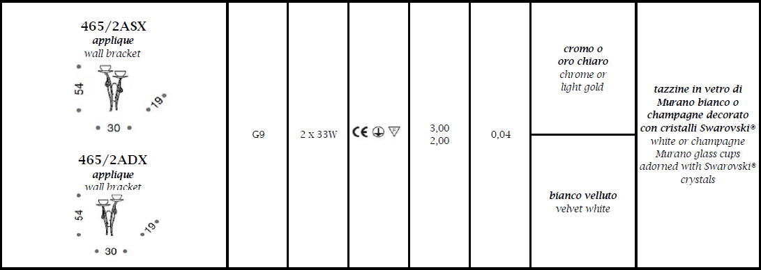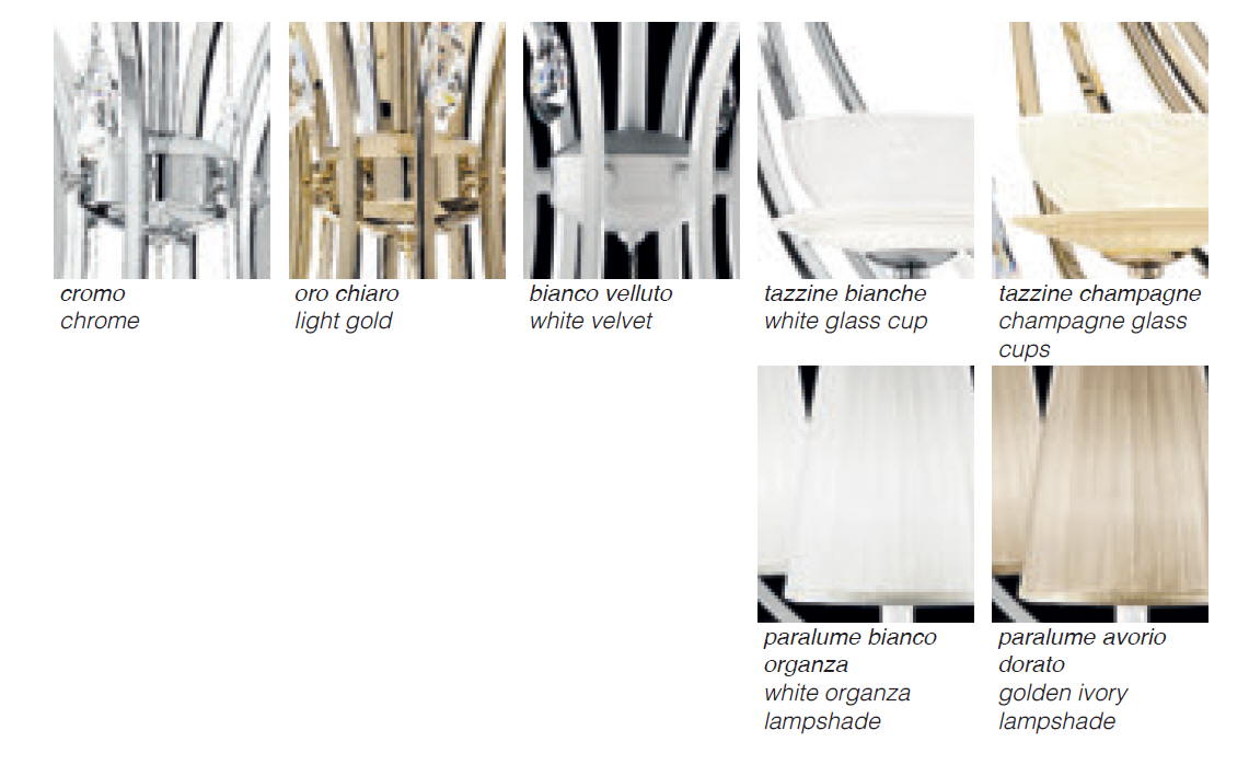 Kinkiet VIBE 465/2A, 466/2A - dekoracyjna lampa, konstrukcja metalowa w kilku wariantach kolorystycznych; klosze szklane w kształcie filiżanki w modelu 465, w modelu 466 klasyczne z organzy; specyfikacja produktu poniżej; oryginalny produkt włoski.