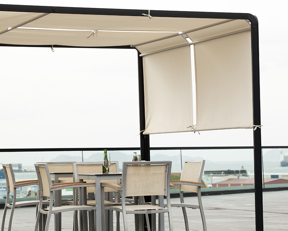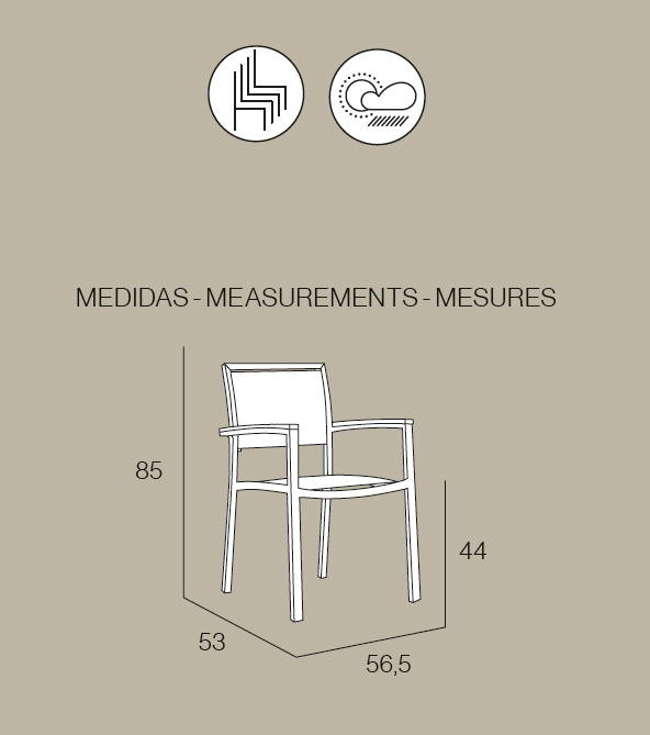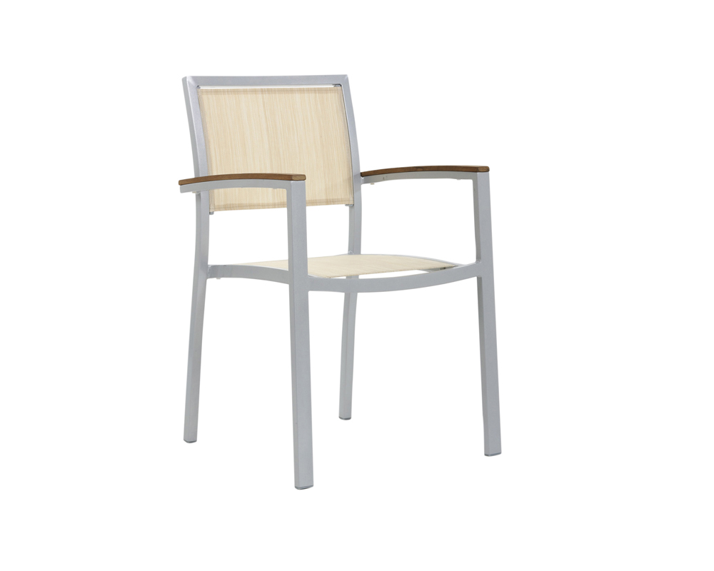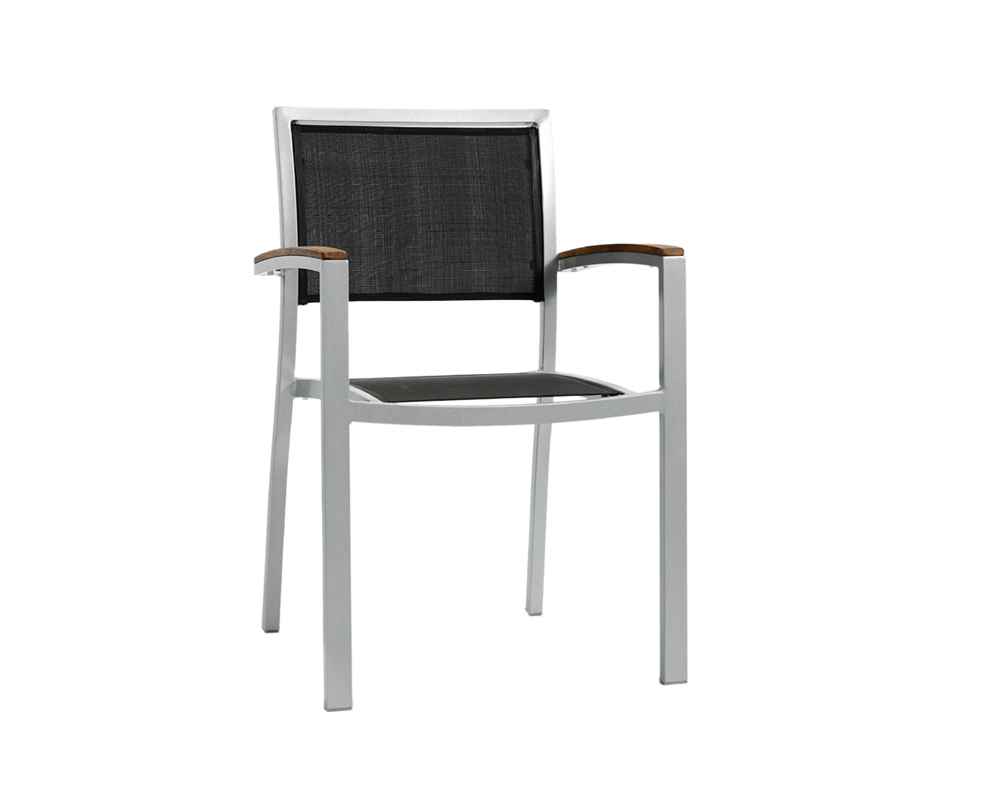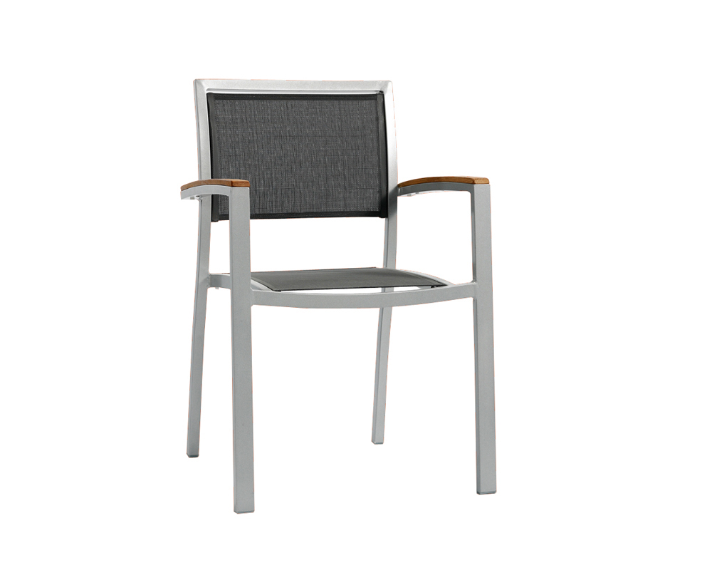 Krzesło MONACO; korpus krzesła wykonany z aluminium lakierowanego na szaro, siedzisko i oparcie wyłożone siateczką z tkaniny Textilene odpornej na działanie czynników atmosferycznych - ORYGINALNY PRODUKT HISZPAŃSKI. Dokładne wymiary na zdjęciu w galerii. Krzesło do użytku zarówno do wnętrz jak i na zewnątrz pomieszczeń. Podłokietniki krzesła wyłożone eco-drewnem odpornym na warunki atmosferyczne. Możliwość sztaplowania krzeseł.