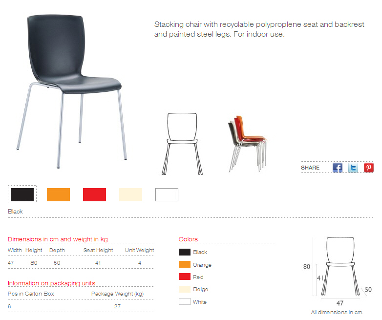 Krzesło Mio Siesta doskonałe do użytku domowego lub jako meble kontraktowe dla branży HoReCa. Dostępne 5 podstawowych kolory, krzesło sztaplowane łatwe w składowaniu. Krzesło do użytku wewnątrz pomieszczeń.