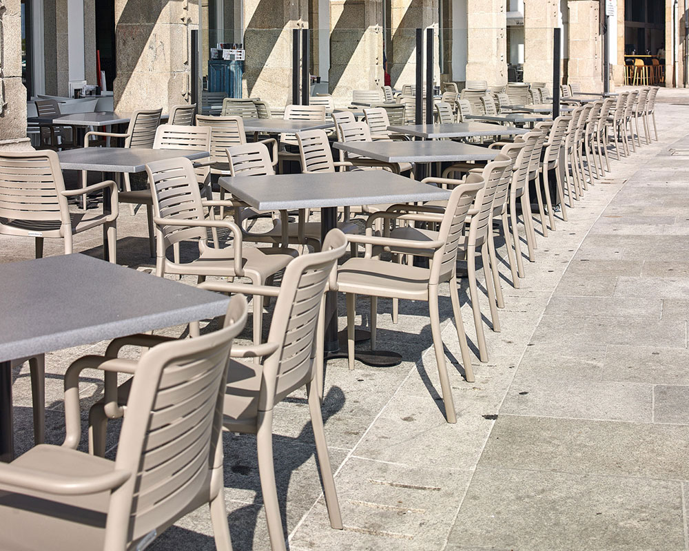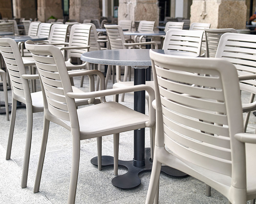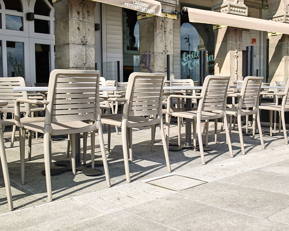 Krzesło PARK z podłokietnikami, wykonane polipropylenu wzmocnionego włóknem szklanym - ORYGINALNY PRODUKT HISZPAŃSKI. Dokładne wymiary na zdjęciu w galerii. Krzesło przeznaczone do użytku zarówno do wnętrz jak i na zewnątrz pomieszczeń. Doskonałe krzesło dla branży HoReCa. Możliwość sztaplowania krzeseł.
