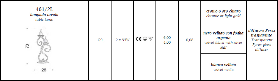 Lampa stołowa 461/2L DECO - elegancka lampa doskonała zarówno do nowoczesnych jak i klasycznych wnętrz; konstrukcja metalowa dostępna w trzech kolorach, klosze ze szkła; specyfikacja produktu poniżej; oryginalny produkt włoski.