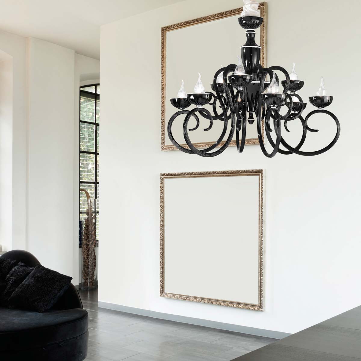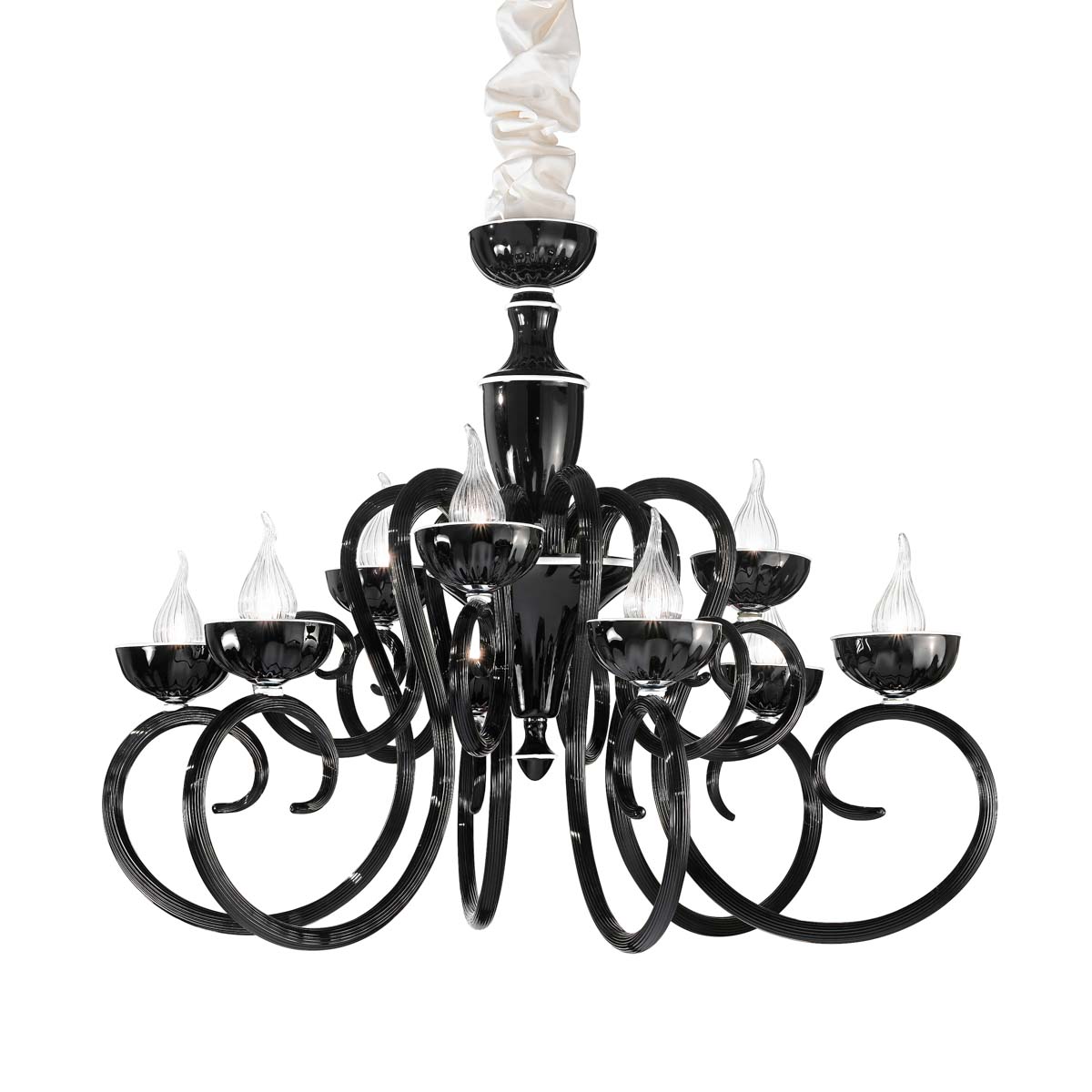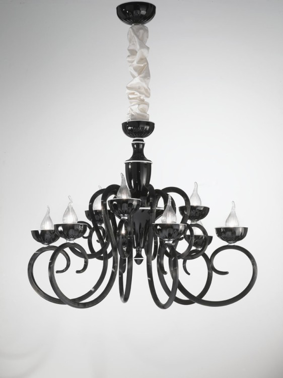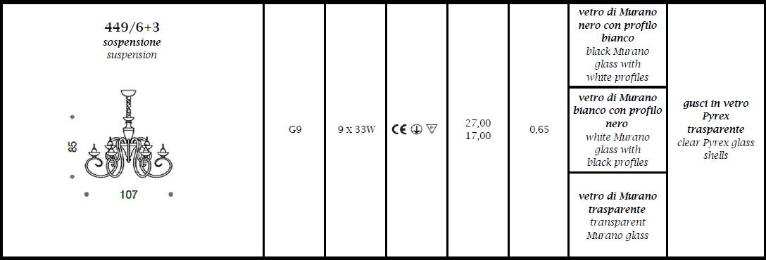 Lampa wisząca, żyrandol BAROQUE 449/6+3 - rama ze szkła Murano dostępna w kliku wariantach kolorystycznych; metalowe elementy w chromowanym wykończeniu; klosze z przeźroczystego szkła Pyrex ; specyfikacja produktu poniżej; oryginalny produkt włoski.