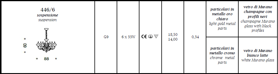 Lampa wisząca, żyrandol EPOQUE 446/6 - efektowna seria lamp, doskonała do wnętrz w tradycyjnym, klasycznym stylu; rama ze szkła Murano dostępna w dwóch kolorach; specyfikacja produktu poniżej; oryginalny produkt włoski.