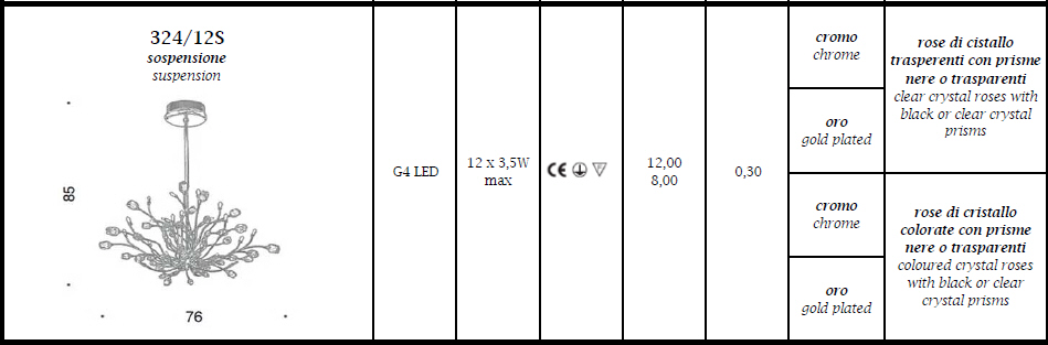 Lampa ROSETTA 324/12S - wisząca, dekoracyjna lampa; efektowna i niepowtarzalna dostępna w kilku wariantach kolorystycznych; rama metalowa chromowana lub wykończona złotem; dekorację stanowią róże ze szkła kolorowego lub transparentenego; specyfikacja produktu poniżej; oryginalny produkt włoski.