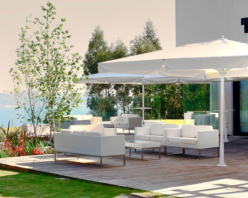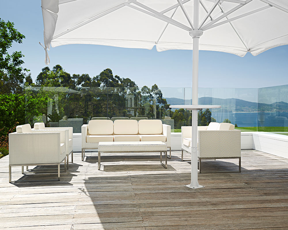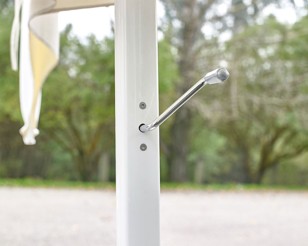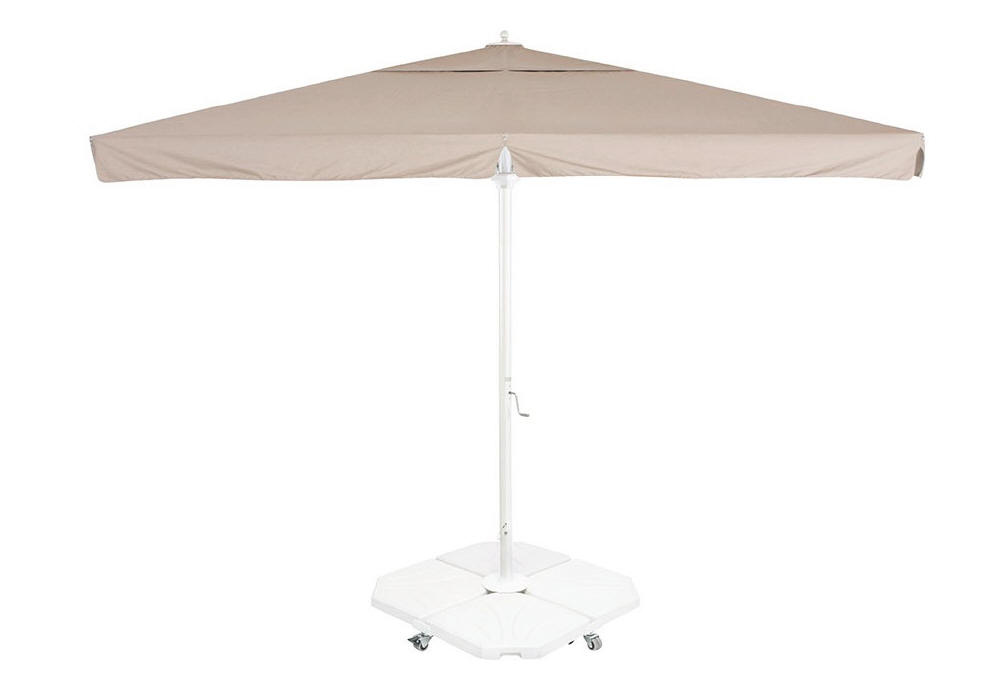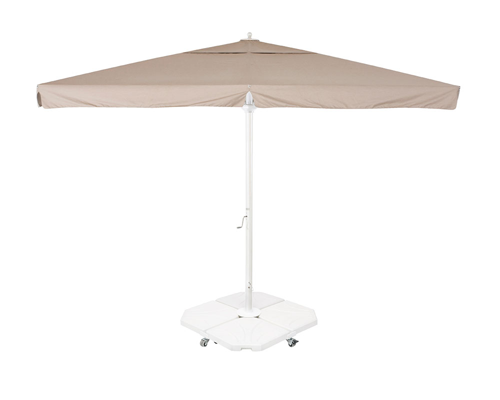 Parasol RIO; duży klasyczny parasol na stelażu aluminiowym w kolorze białym. Solidne i bardzo staranne wykonanie zapewni zadowolenie i długie użytkowanie. Produkt Europejski. Poszycie dostępne z tkaniny olefin w trzech kolorach: czarny, taup i ecru lub z poliestru (water repellent) w kolorze białym. Parasol jest wyposażony w system łatwego otwierania.