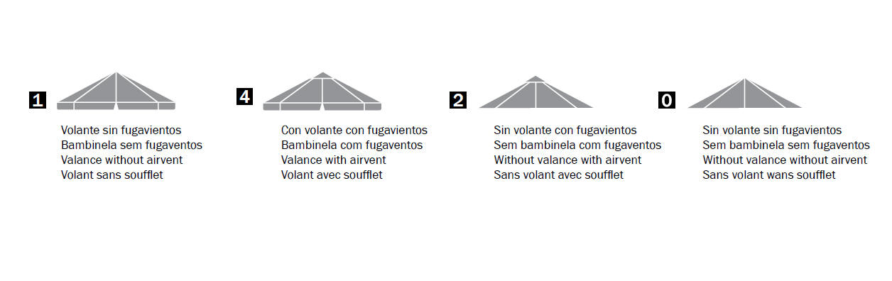 Do wyboru 4 rodzaje wykończenia poszycia: wariant 4 - z wywietrznikiem i z falbaną; wariant 2 - z wywietrznikiem i bez falbany; wariant 1 - bez wywietrznika i z falbaną; wariant 0 - bez wywietrznika i bez falbany.