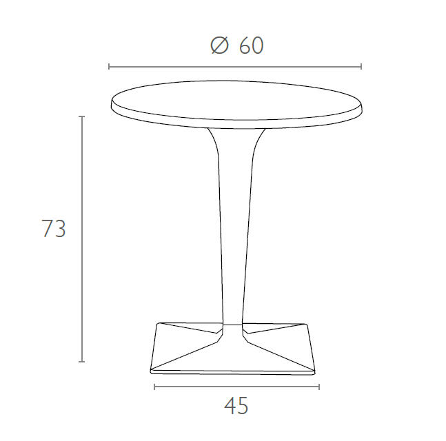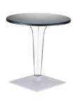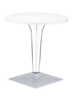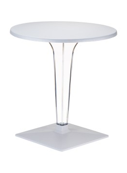 Stół okrągły ICE 60; blat z werzalitu; noga wykonane z wysokiej jakości transparentnego gładkiego poliwęglanu, który doskonale imituje szkło nadając niebanalny charakter; podstawę stanowi aluminiowa baza. Doskonały stolik do ogrodu czy na taras ale szczególnie polecany do użytku komercyjnego doskonały stolik do restauracyjnego ogródka czy na hotelowy taras. Dokładne wymiary na zdjęciu w galerii.