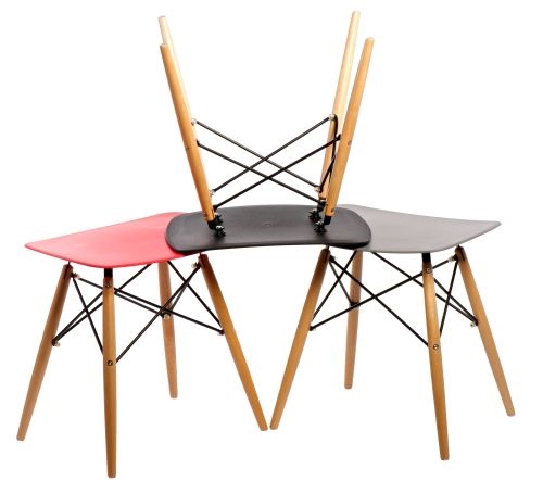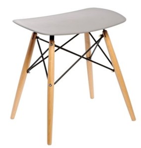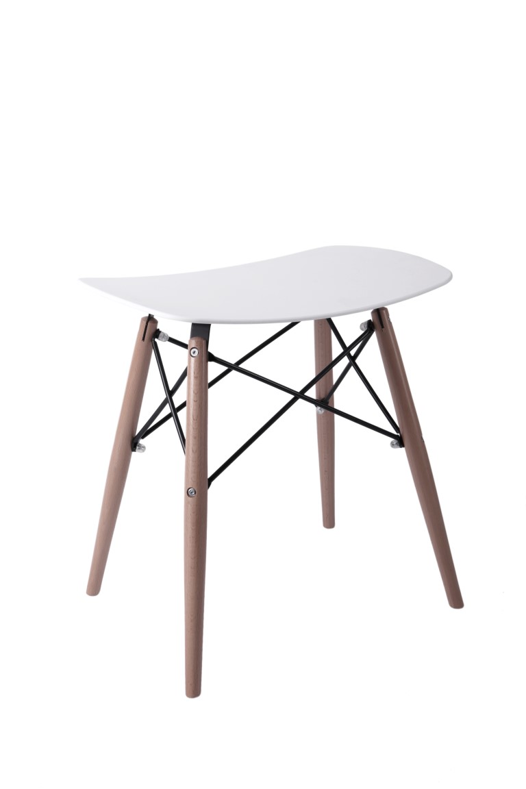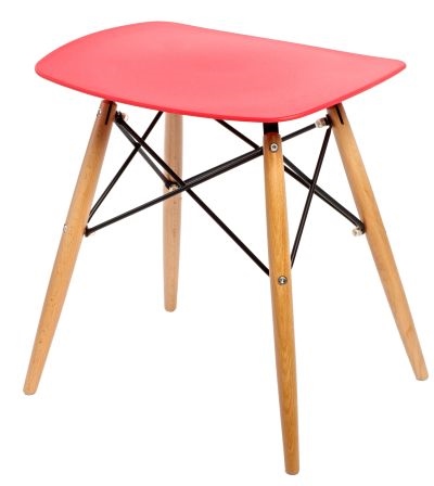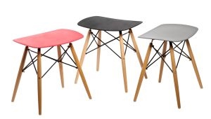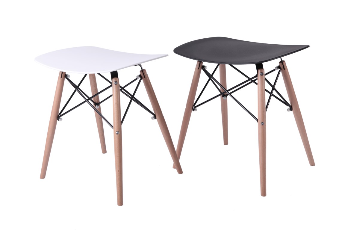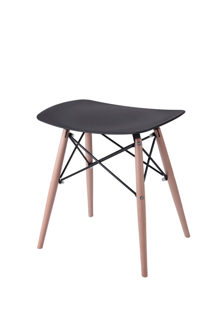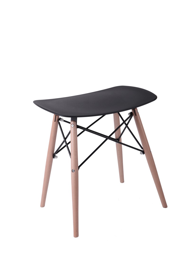 Taboret nowoczesny PIXEL; siedzisko z półmatowego polipropylenu w 4 kolorach; podstawa z drewna bukowego z metalowymi malowanymi na czarno łącznikami.